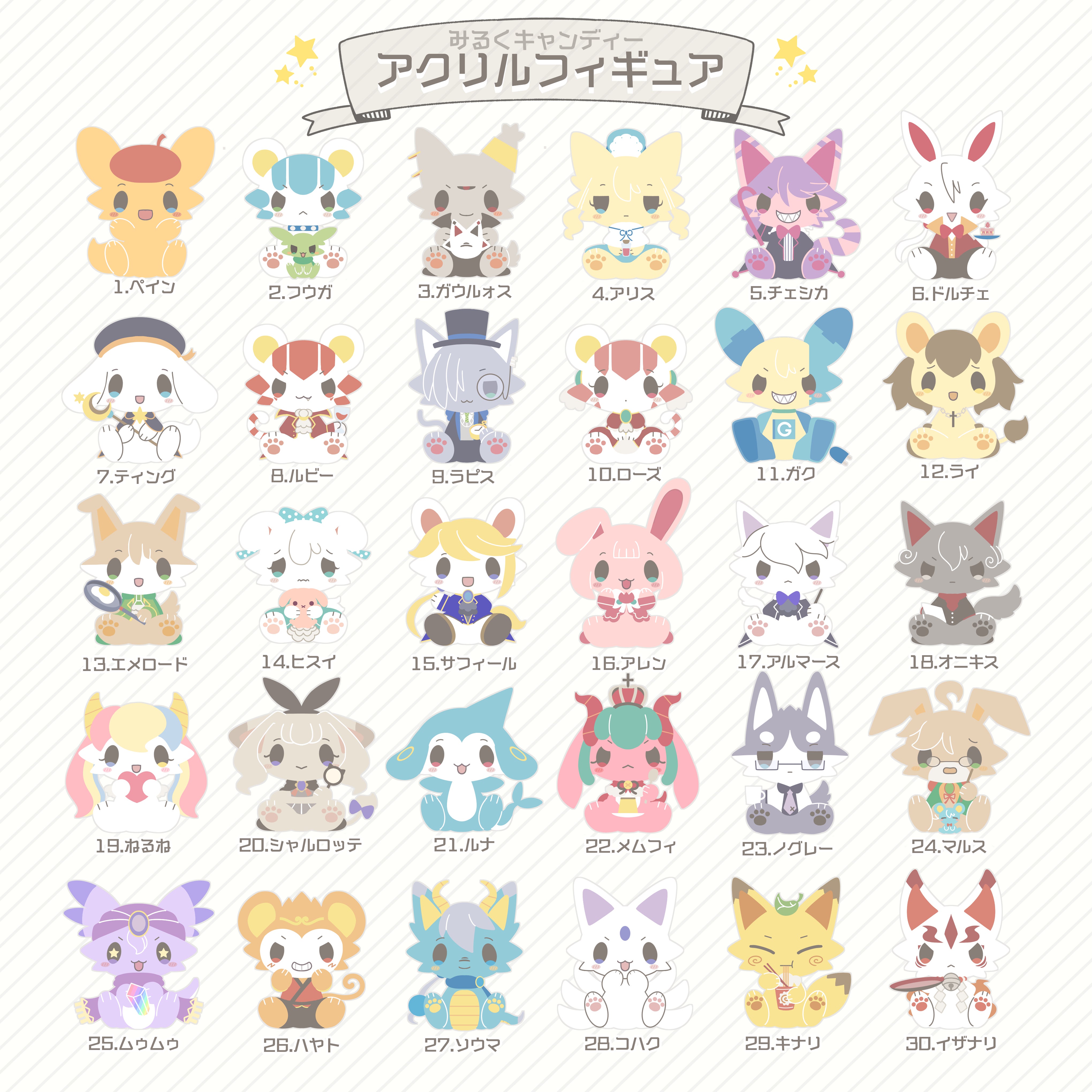 従来のアクリルキーホルダーとは違って白いアクリルでフチなしのみるくキャンディー風のかわいらしいものになる予定です。ぜひお気に入りの子たちを並べて飾ってみて下さい!