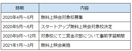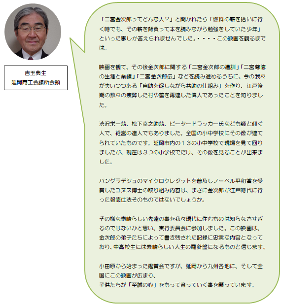 金次郎の故郷である神奈川県小田原市で鑑賞したときの感動から、「延岡の子どもたちとぜひ金次郎の生き様・考え方を共有したい!」という衝動に突き動かされ、矢も盾もたまらず映画を製作されたストームピクチャーズ様へご連絡したことがはじまりです。