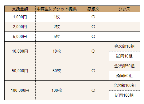1000円ご支援いただくことで、中高生1人がこの映画を無料で鑑賞することができます。みなさまへの返礼品といたしましては、鑑賞した中高生の感想や映画「二宮金次郎」グッズもしくは延岡グッズをお届けいたします。