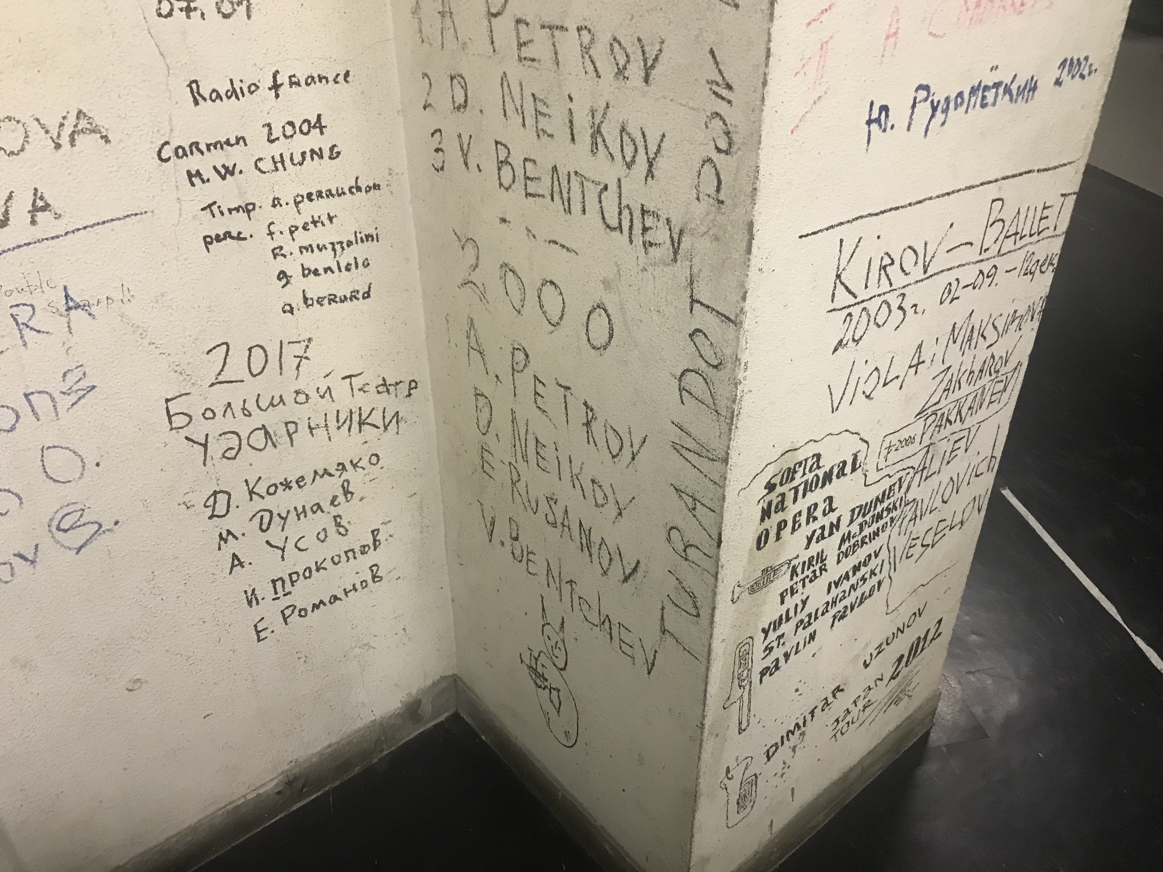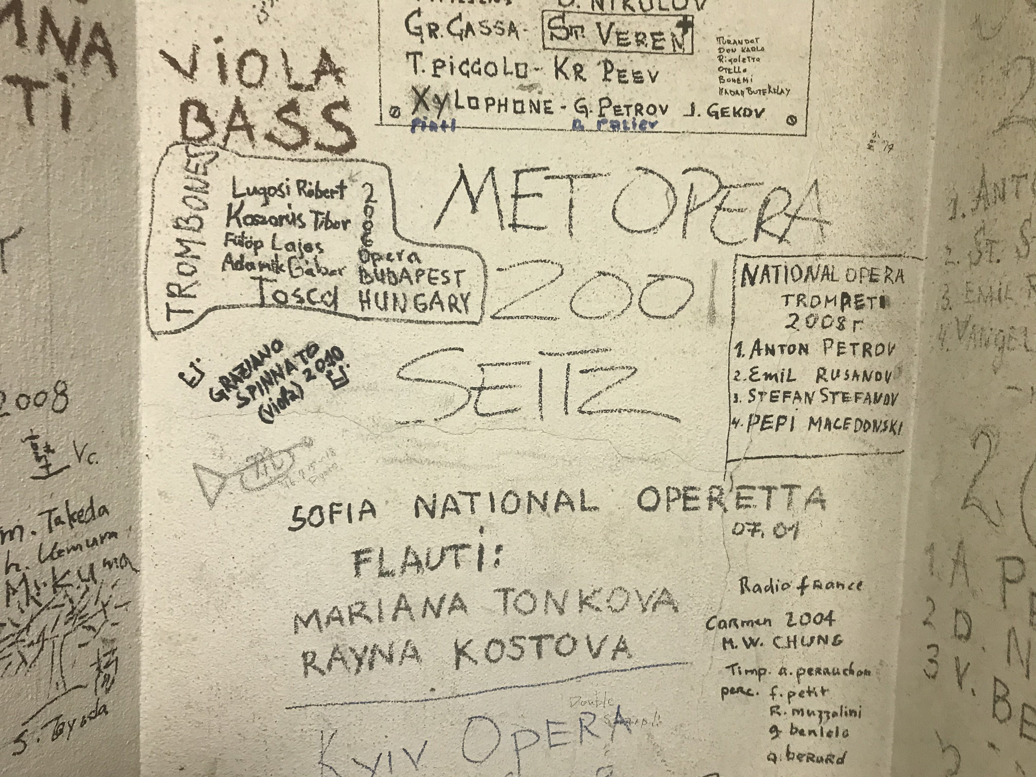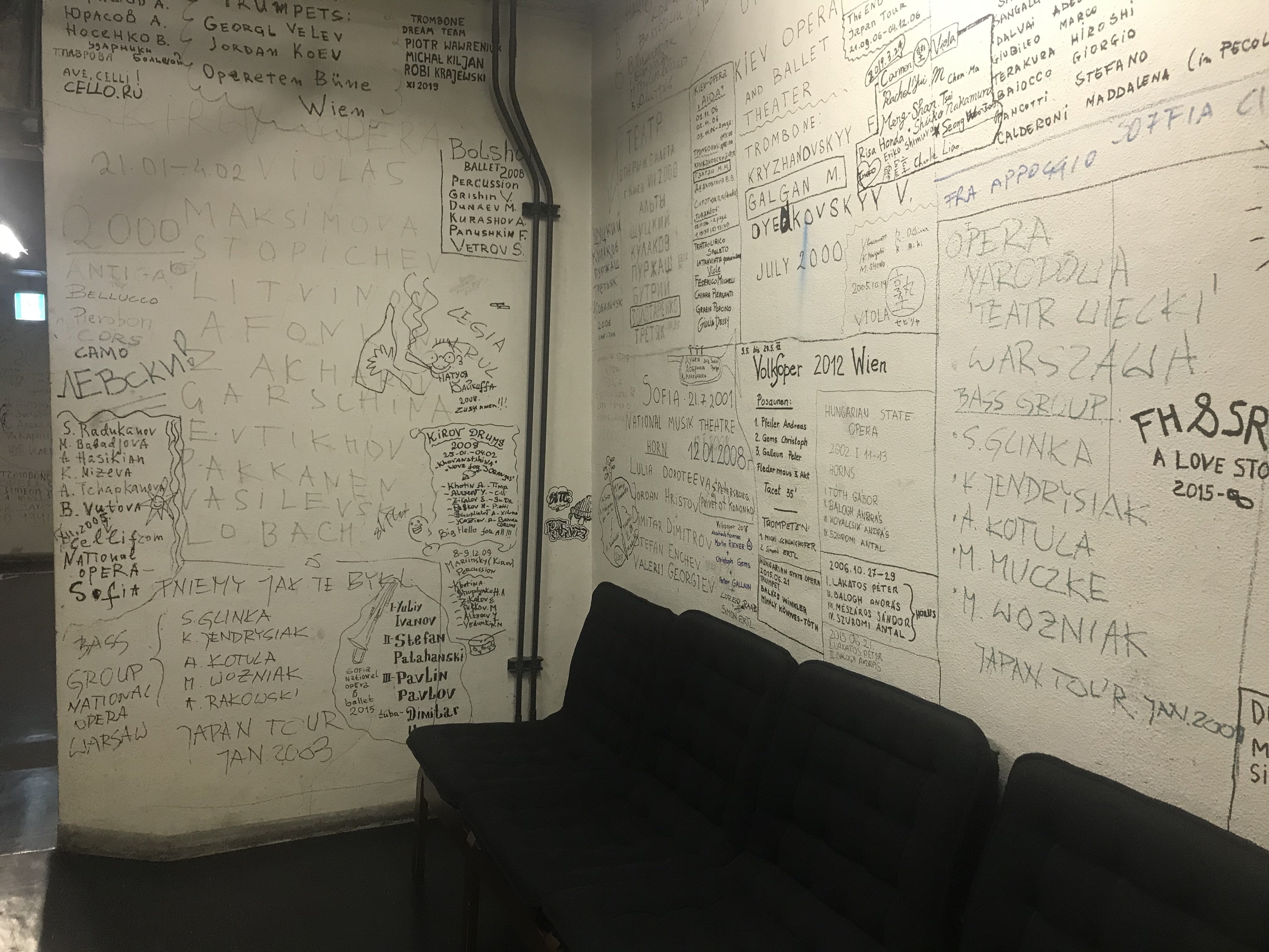 ちなみにオーケストラピットの裏側の壁や、いたるところに、世界中のプライヤーのたくさんのサインがあるんですよ。