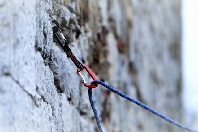 岩に取り付けたハンガーと登攀時のクイックドロー