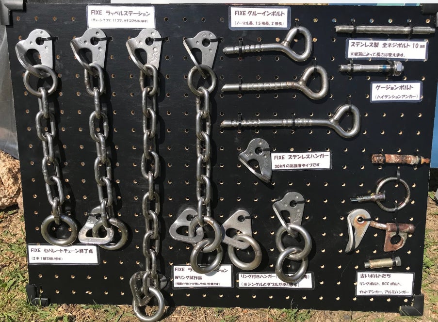 国体合宿の写真(岩手)現在、開拓チームがルートの設定や安全を確保する為のボルトを、合わせて危険な岩の除去などを行なっています。ルートを設定する為には、ボルトとハンガー(写真)を適度な距離で取り付けながらきりの良い岩場の頂上付近まで設置します。このボルトとハンガーが1本のルートで5〜10本必要になります。今回はスチール性のもので対応しますが、このボルトとハンガーがルートの数と長さに比例して数量が必要になり、そこでも資金が必要になってきます。腐食に強いステンレスともなると1セット5000円にもなります。