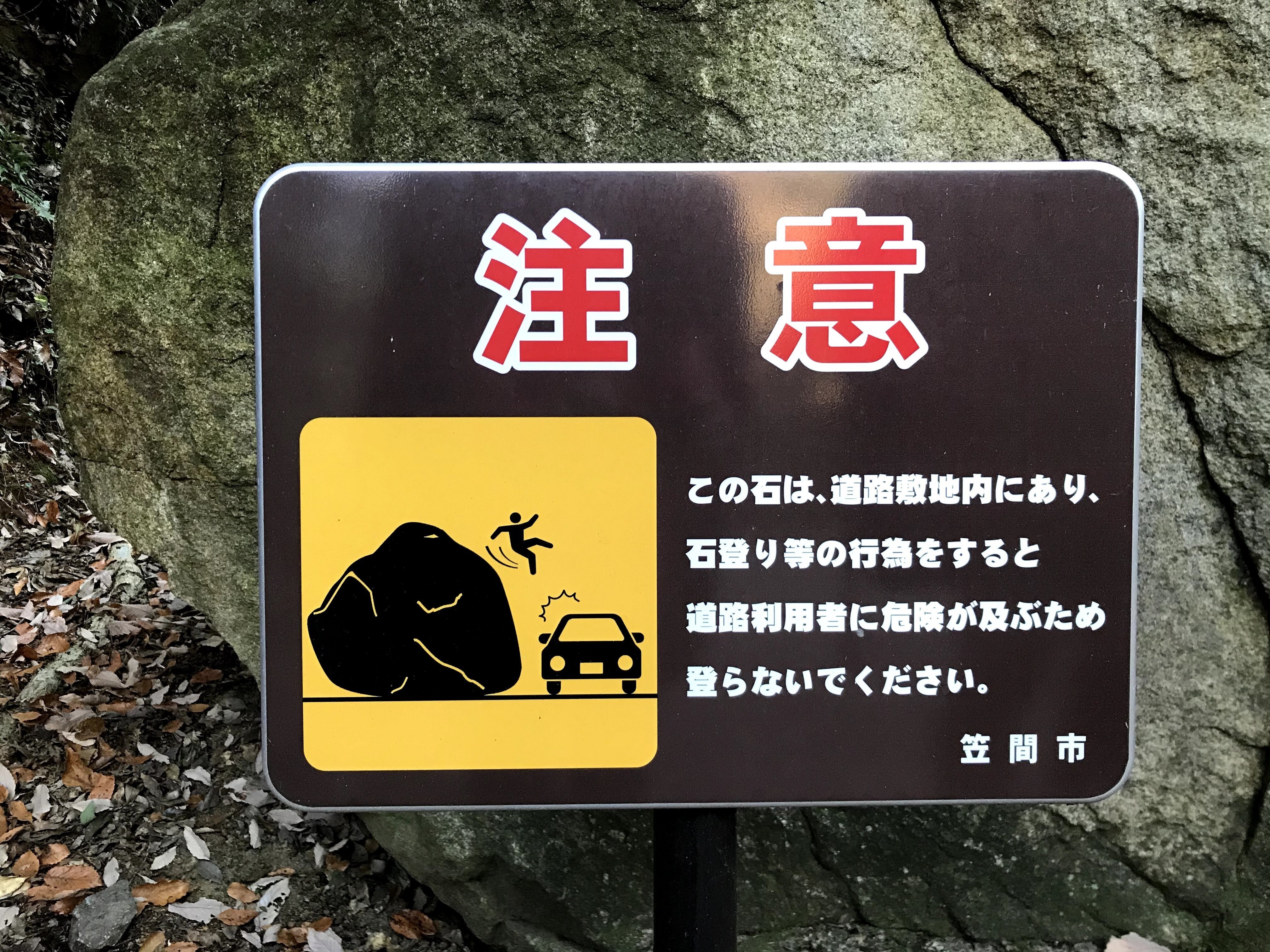 上記の問題が多発している中に、同市内の笠間ボルダーでもクライマーにとって大きな事件がありました。佐白山の道路沿いにある「大黒石」の登攀禁止の立て看板が設置されました。クライマー増加に加え「登れたよ!動画」をSNSにアップしたい人が増えた事で道にはみ出し動画の撮影をする人が多々みられました。道路沿いにあるこの岩は通行の妨げになるため、危険行為として近いうちに登攀禁止になってしまうな〜と思っていた所だったので、この事は私にとっては、ごく自然な流れでした。