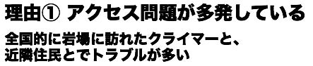大きな理由としては、アクセス問題でトラブルになっている岩場が多いことです。