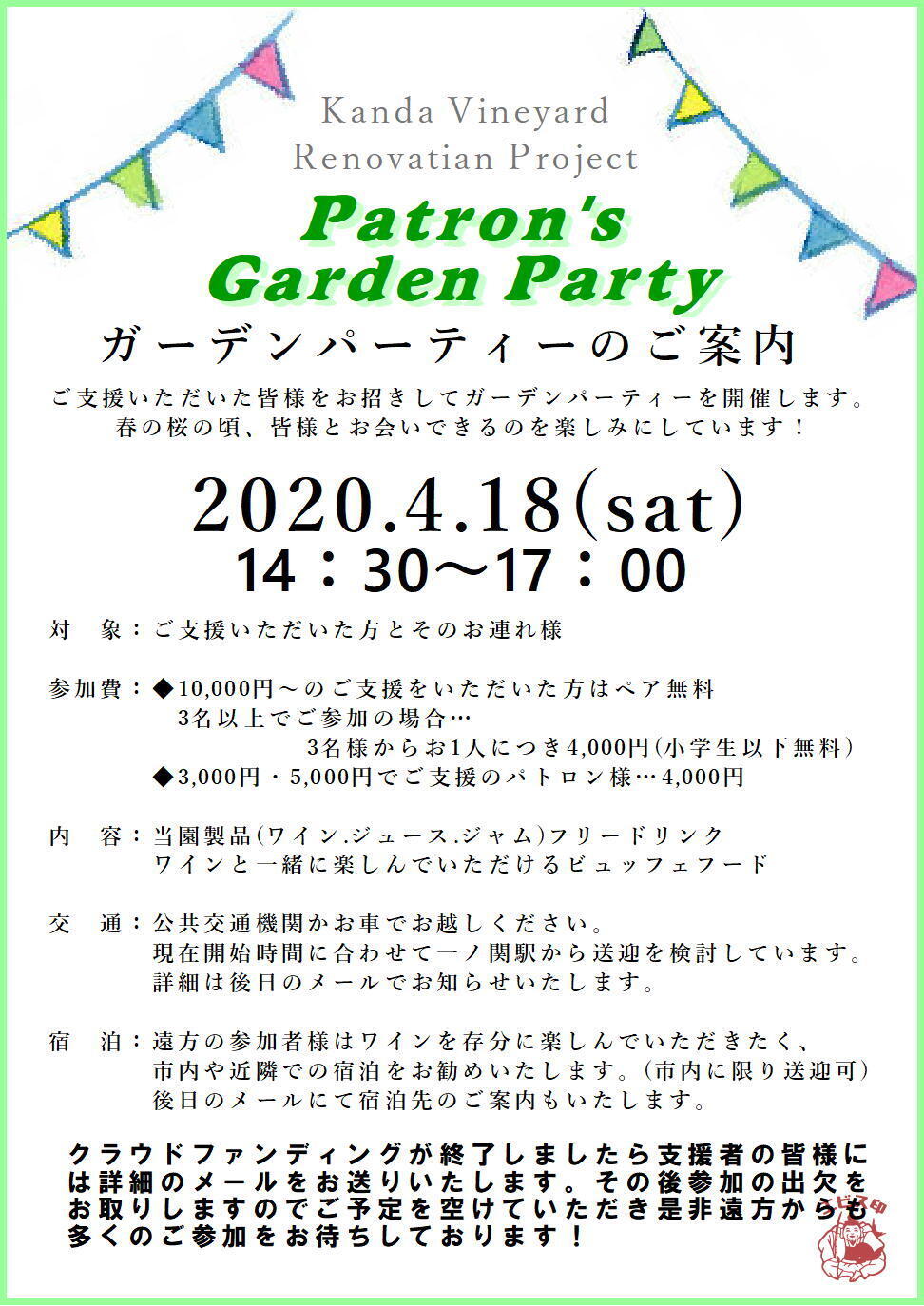 いよいよクラウドファンディングも今週までとなりました。毎日多くのお電話やお問い合わせをいただいています。本当に毎日感謝しながらクラウドファンディングを進めております。支援者も150人を超え金額も大台の200万を超えました。引き続き皆様のご支援よろしくお願いいたします!さて、リターン内容にも記載しておりますガーデンパーティー。リニューアルが終わった暁に皆様をお呼びして感謝の気持ちを伝えながらみんなでリニューアルを祝おう!というイベントです。10,000円からのリターンにはペア無料招待券がついています。その券で当園のワインやジュース、そしてビュッフェフードがお楽しみいただけます。また普段お見せしない当園の醸造所や葡萄畑を園主がご案内する見学ツアーや、お子さんもお楽しみいただけるイベントなども予定しております。今回は支援者の皆様にできる限りのおもてなしをしたいと思っており、ガーデンパーティーにはパトロンの皆様とそのお連れ様だけをお招きして行います!我々スタッフも皆様と一緒に楽しませていただきます。ちょうど開催する時期は陸前高田は桜の時期。春のあたたかな陽気(のはず?)のもとお庭でみんなでワインやジュース片手にワイワイやりましょう!是非今からスケジュールを空けていただき、遠方からも沢山のお越しをお待ちしております!クラウドファンディングが終了後、パトロンの皆様にはガーデンパーティーの詳細のメールをお送りさせていただきます。その後参加の可否を教えていただく流れで進めてまいります。ご不明な点がありましたらお気軽にお問い合わせください。