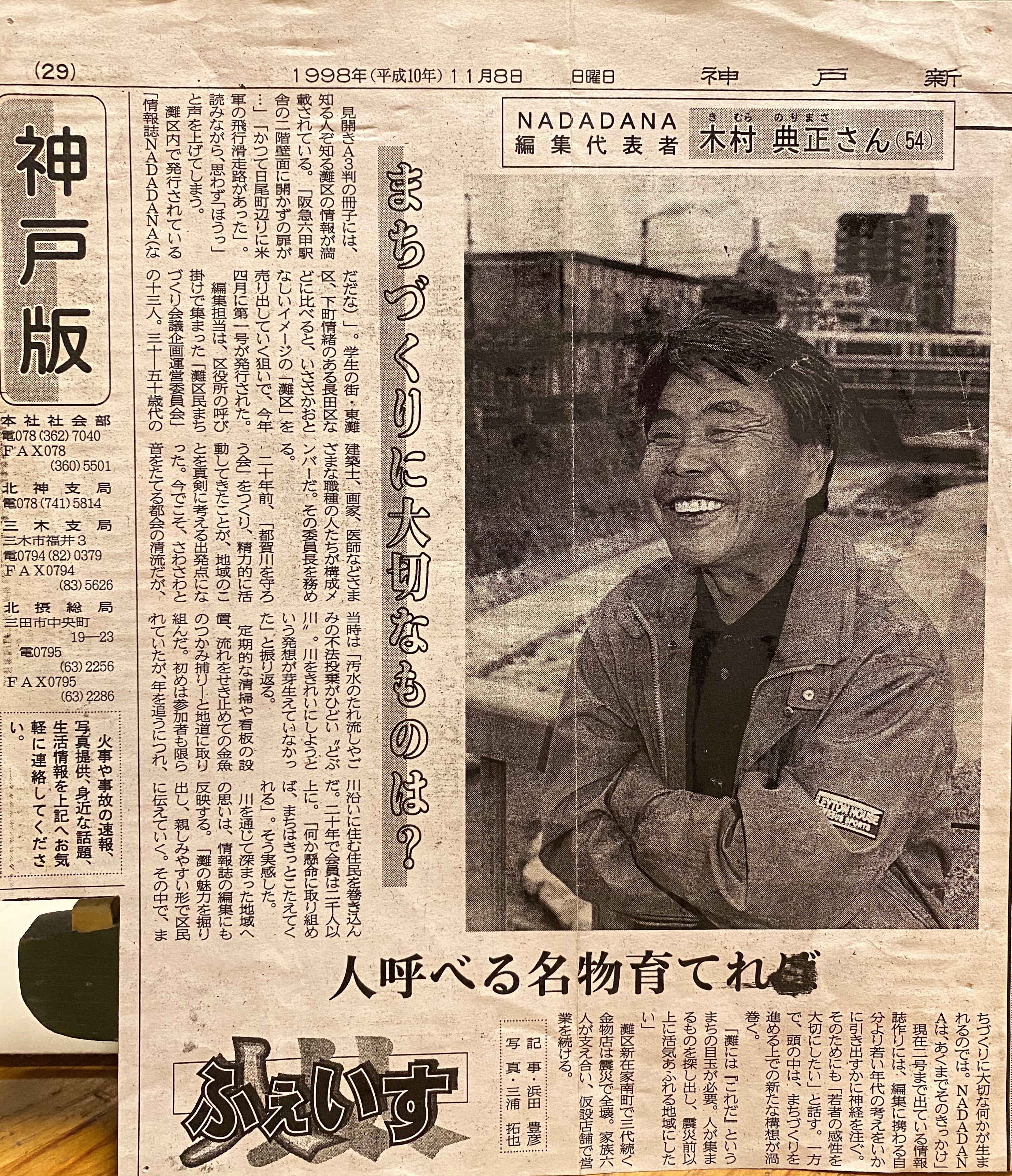 わたしの亡き父 木村典正は、20代の頃、地元にひまわり子ども会を立ち上げたのを皮切りに、ドブ川だった都賀川を鮎が遡上するまでに美化した「都賀川を守ろう会」の立ち上げ、灘区まちづくり協議会の議長を務めるなど、50年に渡り地域の為に地道な活動を行っていました。