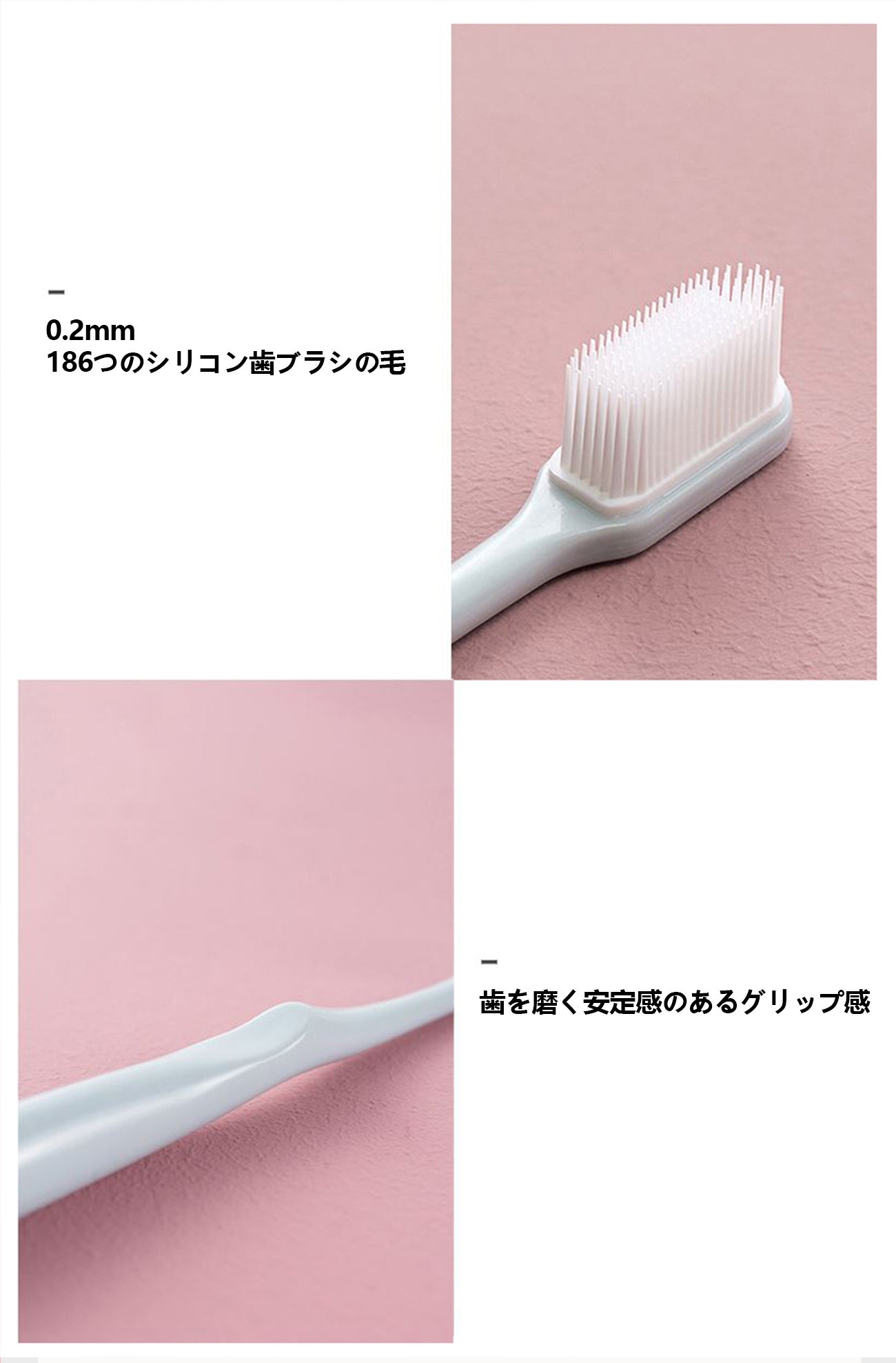 歯ブラシ選びにおいて、一番重要視されるのが断然歯ブラシの毛です。歯茎が弱く、幼児用の歯ブラシの大半がシリコンなのも全てに理由があります。医療用としても使われるTPUシリコン歯ブラシの毛を使い驚くべき洗浄力を実現しました。0.2mm、186つのシリコン毛の歯ブラシを一度体感すると、従来の歯ブラシには二度と戻れません!