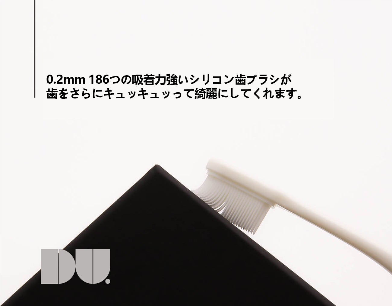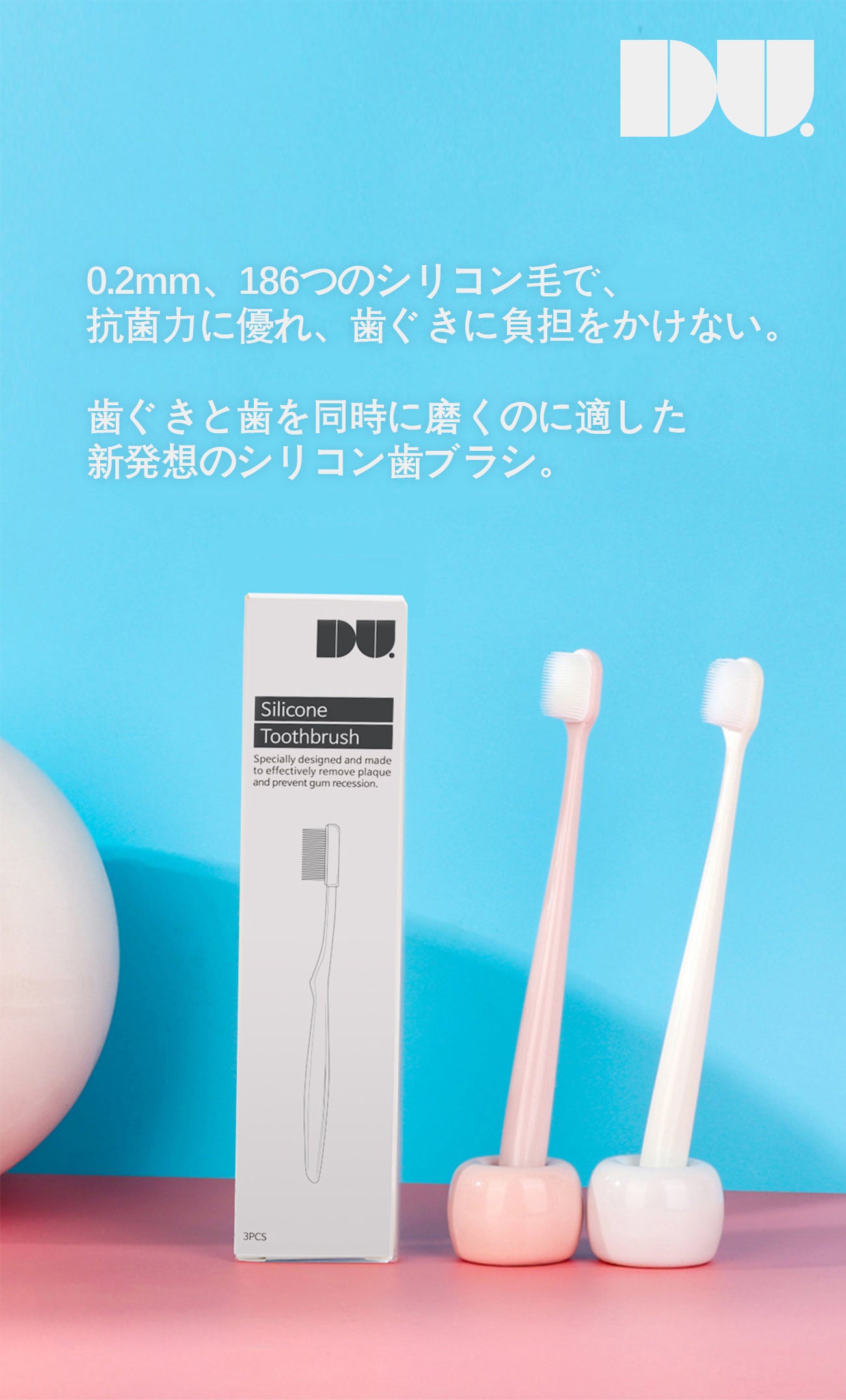 DU シリコン歯ブラシは、従来のナイロン毛歯ブラシとは異なり、抗菌力に優れ、歯ぐきに負担をかけない、歯ぐきと歯を同時に磨くのに適した新発想の歯ブラシです。