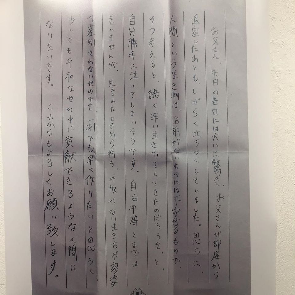 そして、話の中で出てきた当時中三の次男からもらった手紙です。未成年の子供がいる夫婦が「夫夫」あるいは「婦婦」になっても子供が混乱を起こすことはありません!