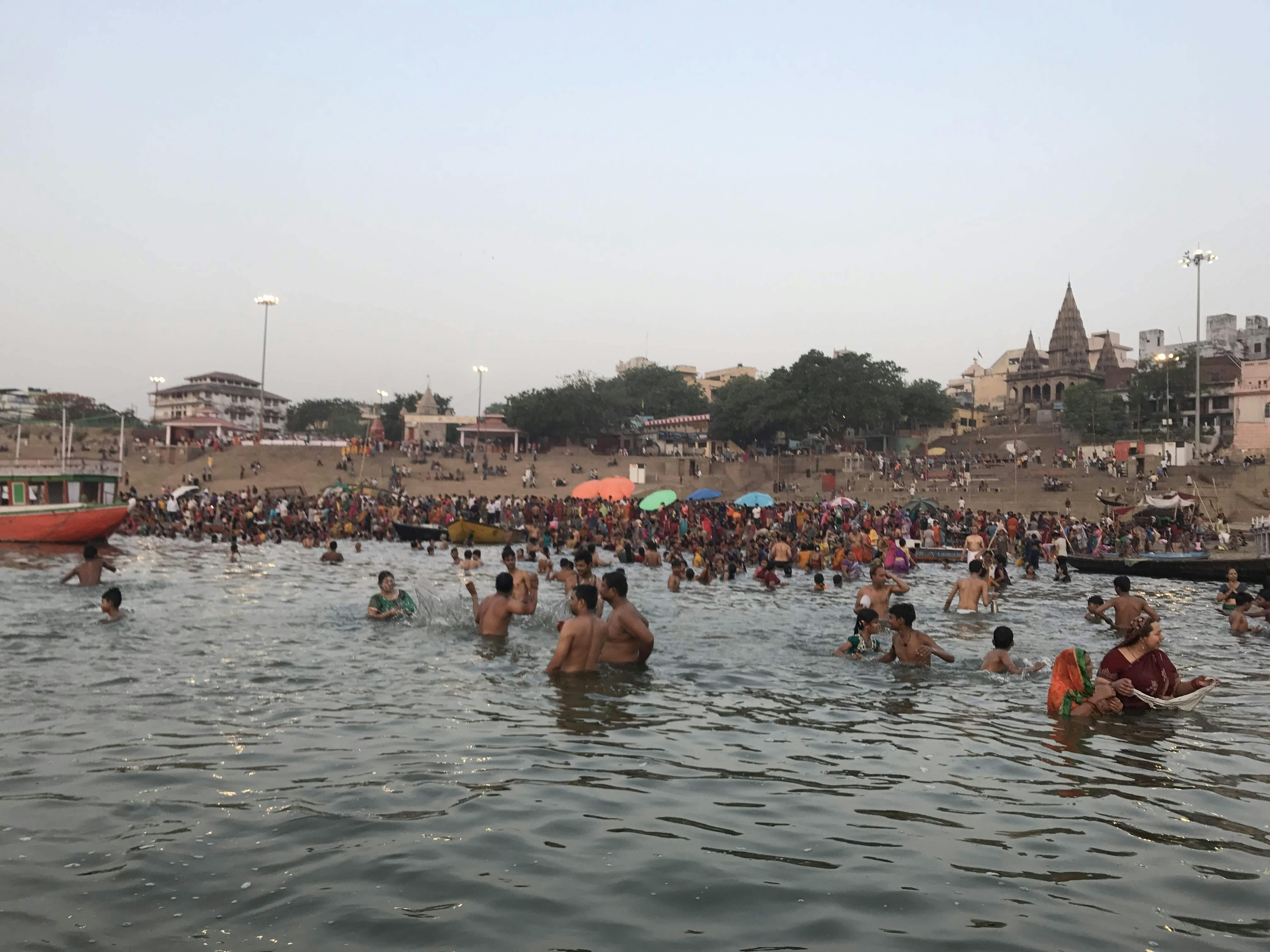 沐浴をしたり、死者の遺灰を流したり、洗濯をしたり、シャンプーやボディーソープを使ってお風呂のようにしたり。人々の生と死が、時間が、聖なるガンジスの流れに流されていく。