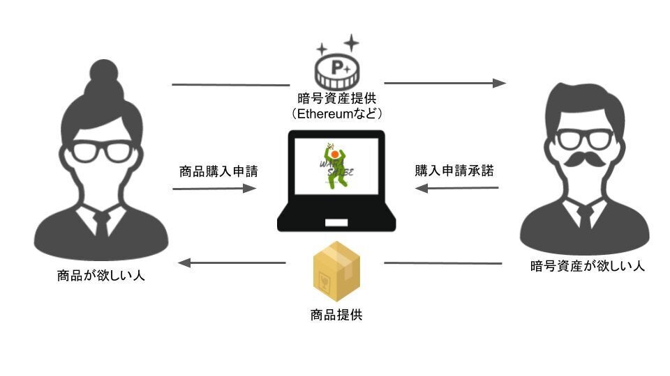 自分の手持ちの商品や不用品を売って暗号資産と交換したい人と暗号資産でモノが買いたい人をマッチングします。メルカリを複数の暗号資産で行うイメージです。