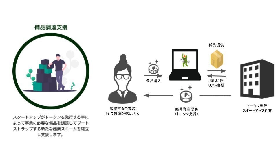 スタートアップがトークン(暗号資産)を発行することによって事業に必要な備品を調達できる新たな起業スキームを提案し、投機性の低い実需に即したトークンの普及方法を支援します。プロジェクトに先駆けて実地した実証実験では1時間に100万円弱相当の備品調達に成功しました。