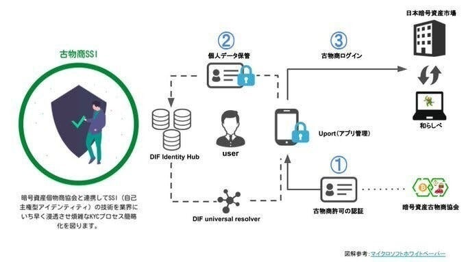 ブロックチェーンに基づいたより安全性と利便性の高いSSI(自己主権型アイデンティティ)という技術を用いて、古物商許可証の認証を行います。これによって許可証を掲示して取引をしている信用性の高いユーザーを可視化します。