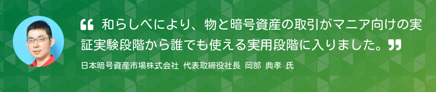 なぜ暗号資産と物は直接取引できないのか? 暗号資産と物を直接交換したほうが効率的ではないか? この答えを探す為、私は暗号資産取扱古物商となりました。2019年8月のことです。 一番最初に仲間になってくれたのが和らしべCEOの井元さんでした。 井元さんのご縁で長澤さんもこの分野に飛び込んで頂き、爆速開発で実用的な取引プラットフォームができました。 最先端技術が満載なのにそれを感じさせないなめらかなプラットフォームになっているのはお二人の最先端の知見の結晶だと思います。 和らしべにより、物と暗号資産の取引がマニア向けの実証実験段階から誰でも使える実用段階に入りました。 日本暗号資産市場株式会社でも和らしべを活用して物と暗号資産の取引をなめらかにします。 皆様も是非一度和らしべをお試し下さい。