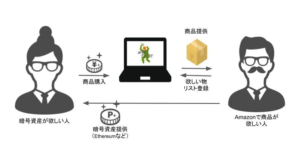 暗号資産で効果的にモノを購入可能にするために、あらゆるモノが売られているアマゾンの商品をほしい物リストを介してお好きな暗号資産で購入可能にしました。アマゾンで商品が欲しい人と、ほしい物リストから代理購入する人をマッチングすることによってこれを実現しています。