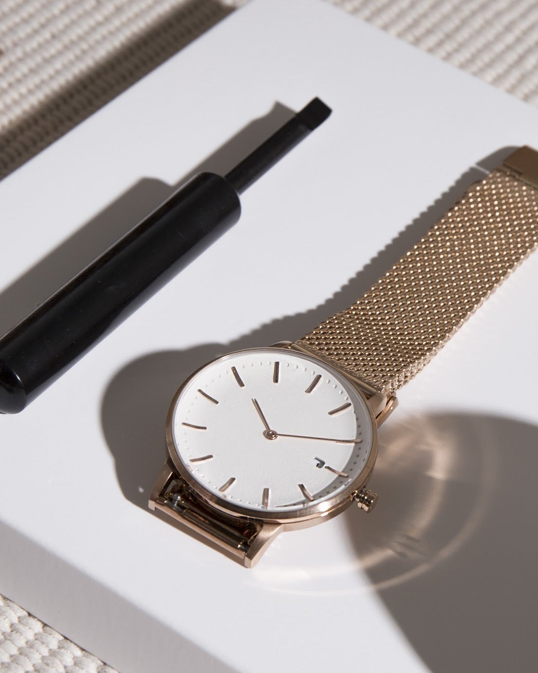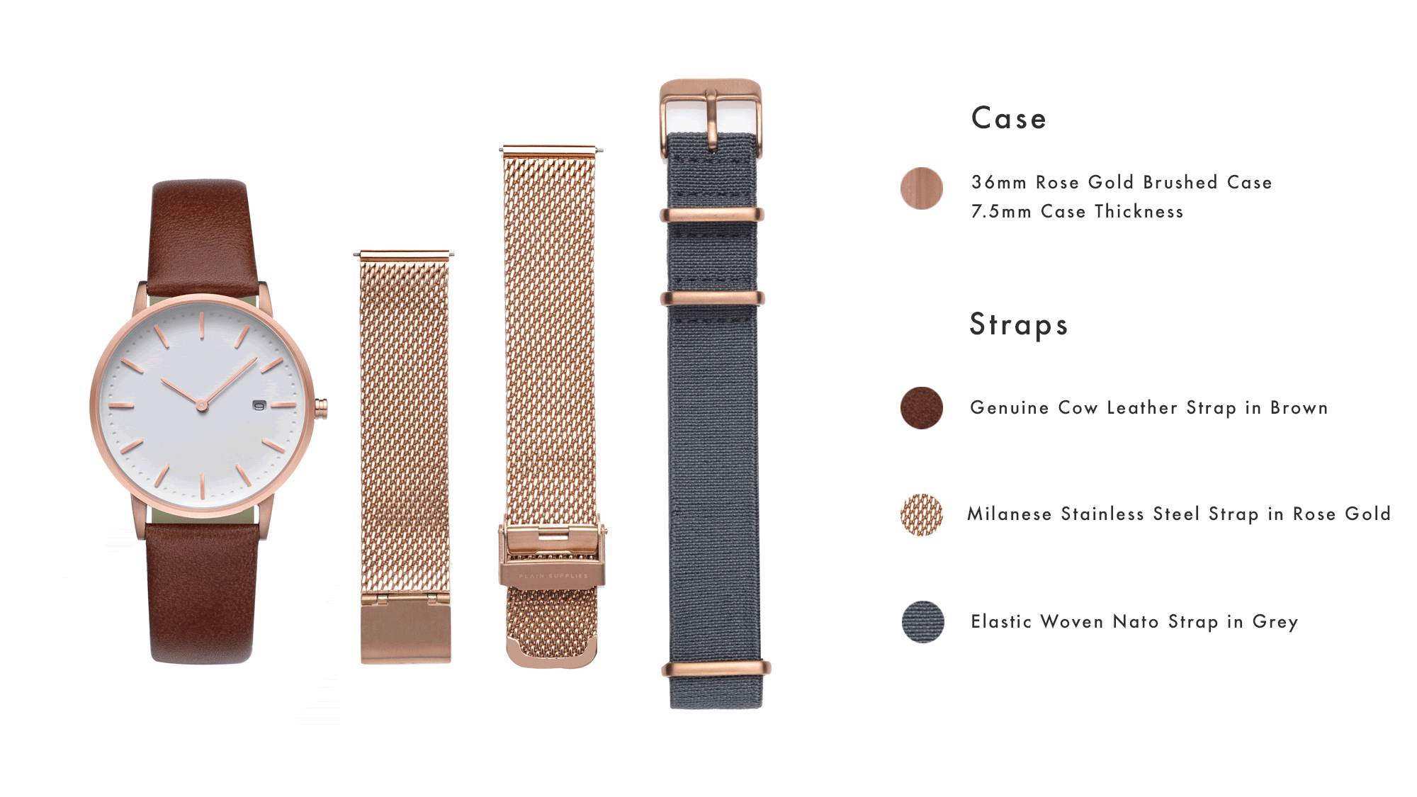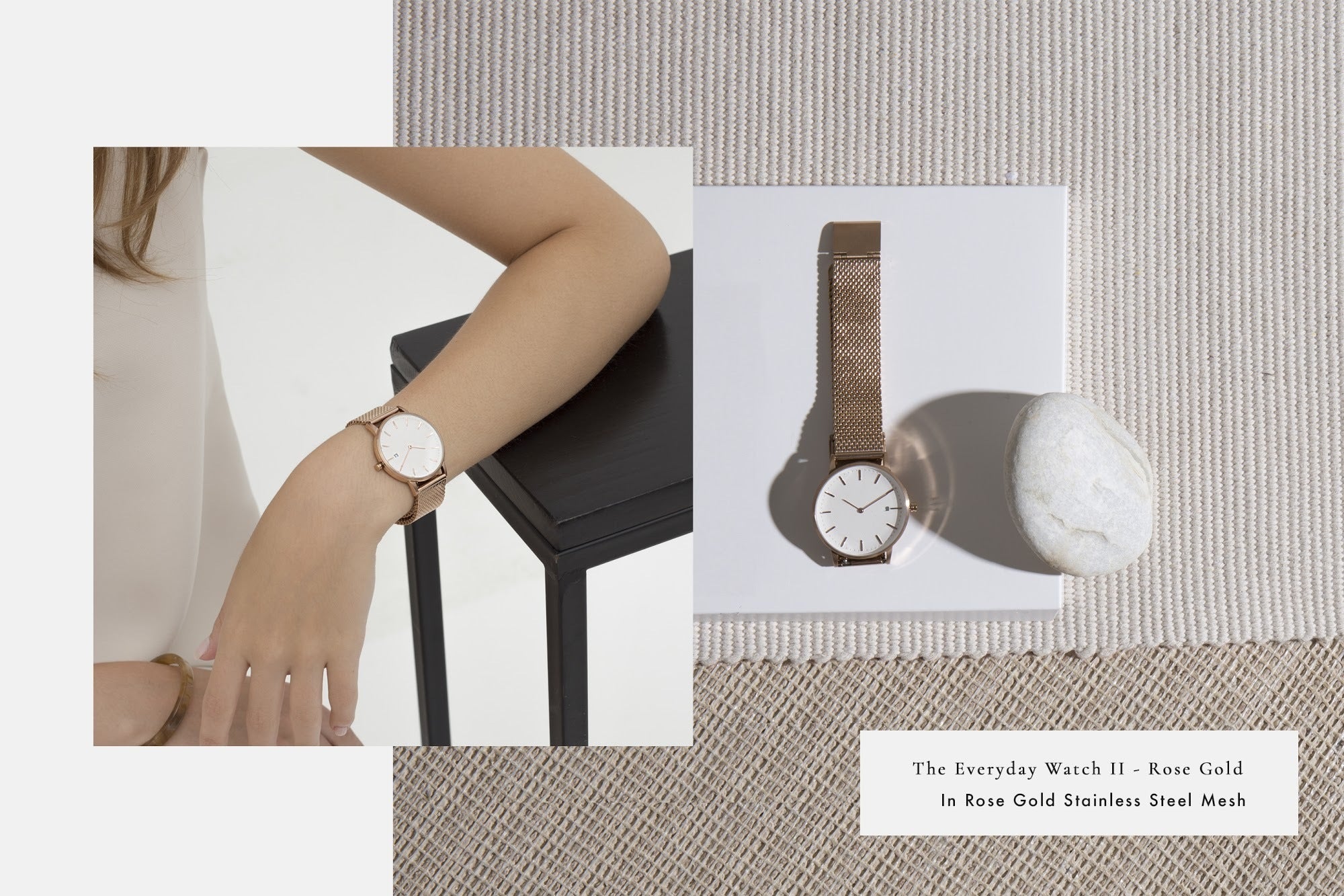 今回新たなモデルとして登場したThe Everyday Watch IIは36mmのローズゴールドと40mmのガンメタルバージョンをご用意しています。両方とも多くの腕時計に使用される316Lステインレス加工のケースで、内部(ムーブメント)には日本のミヨタ製を採用しています。