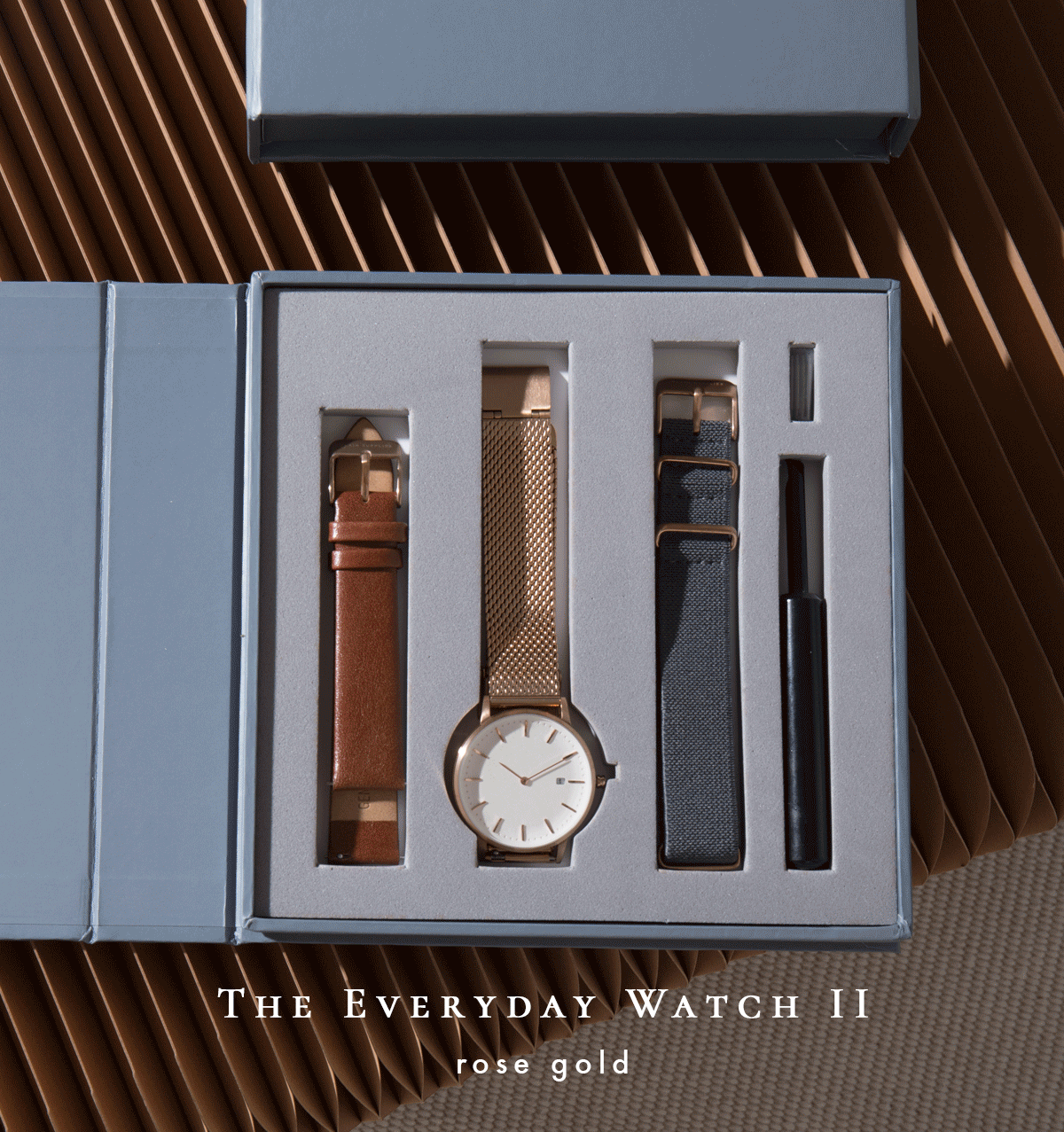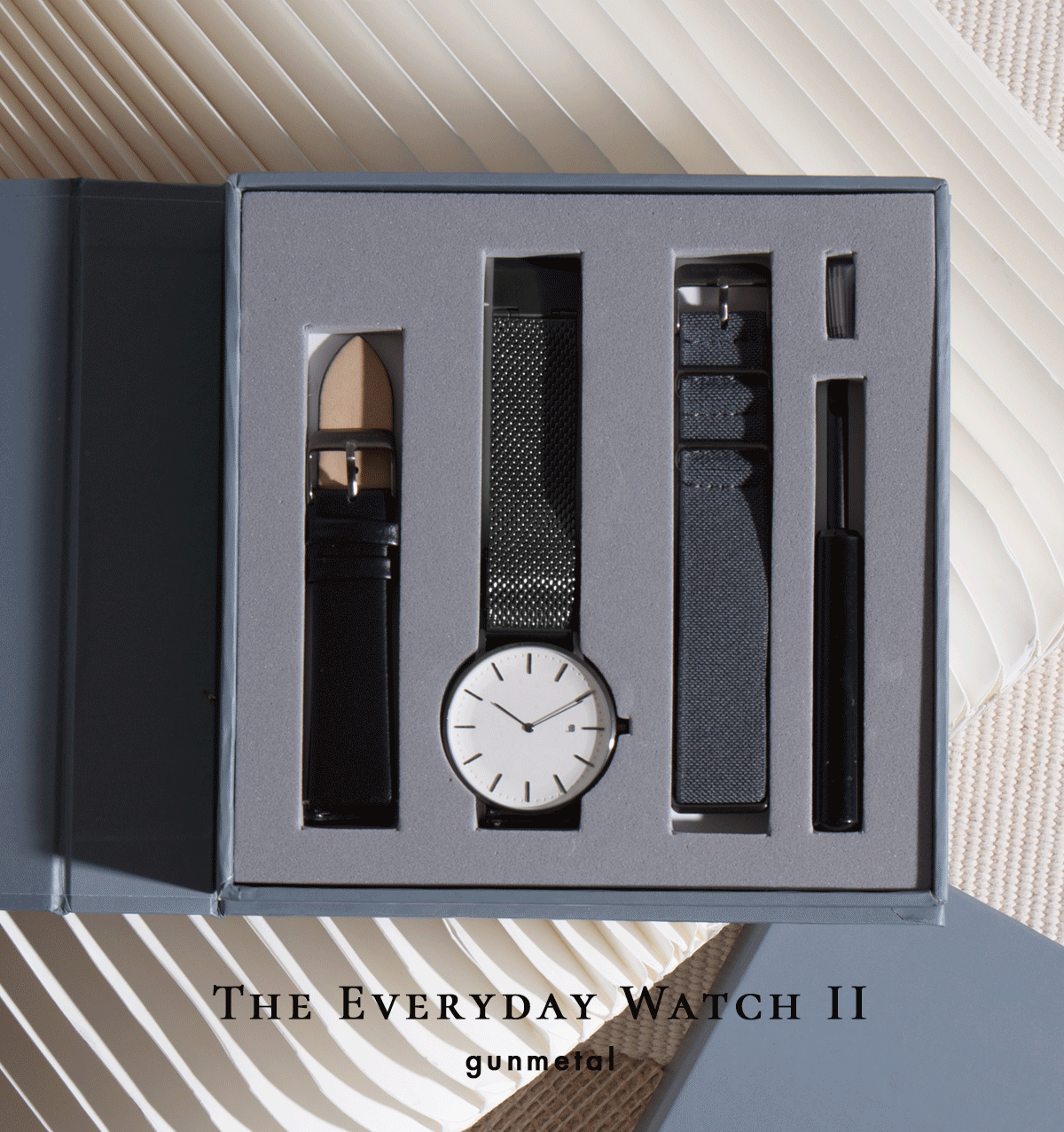 3種類のストラップが交換できる時計The Everyday Watch制作チームは2017年Kickstarter上で誕生しました。ユニセックスなデザインの時計は国内外から高い評価をいただき、ブランドを代表するプロダクトにまで成長しました。