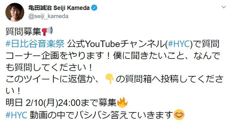 本日(2月10日月曜日)の24時まで、亀田誠治への質問を大募集しています!音楽のこと、ベースのこと、受験勉強のこと、 仕事のこと、人間関係のこと……日比谷音楽祭公式YouTubeチャンネル(HYC)の中で、お答えします。亀田誠治のTwitterからもしくは、下記のフォームから、匿名でご質問いただけます!匿名質問フォーム→https://peing.net/ja/seiji_kameda