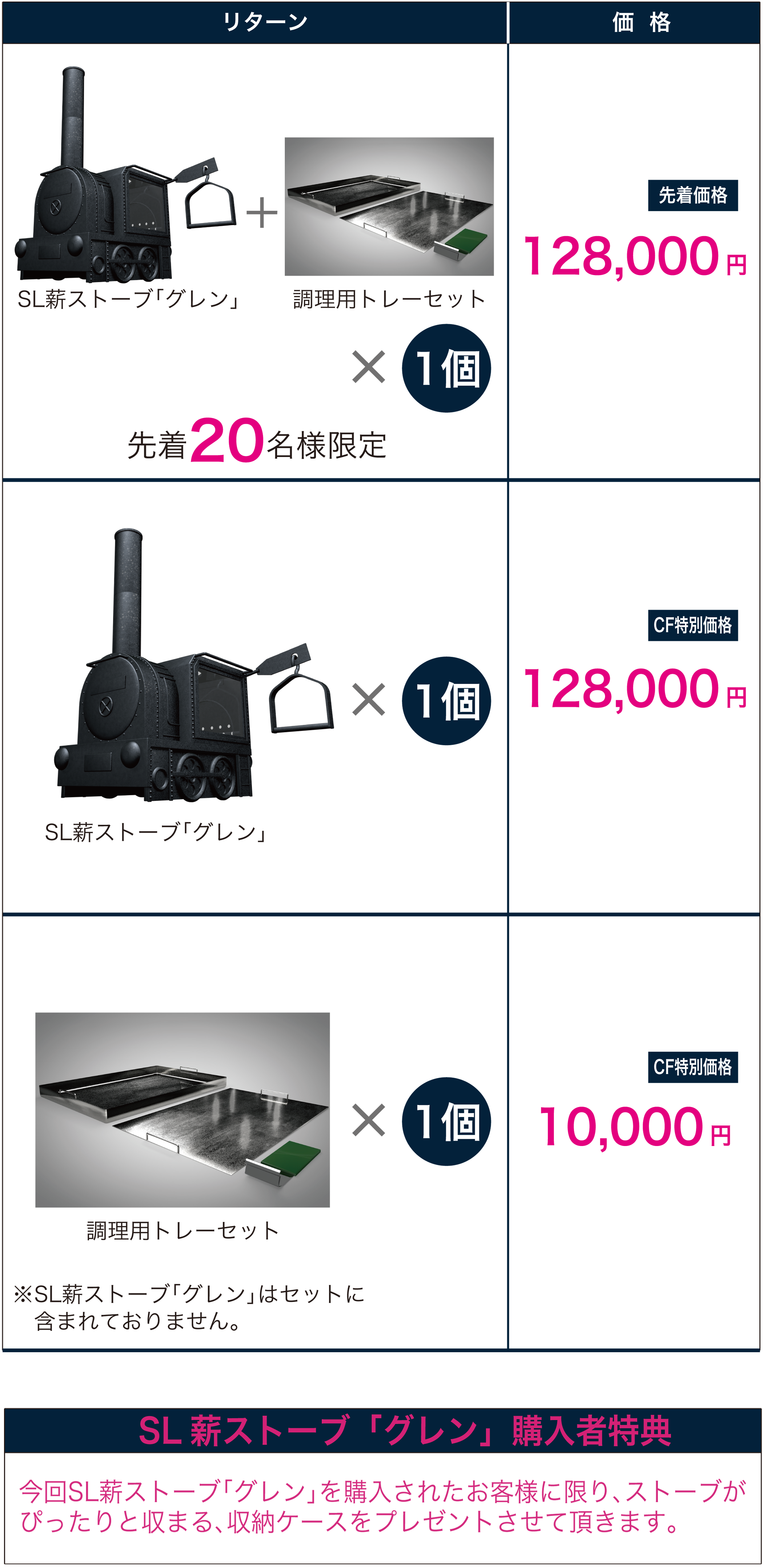 このSL型薪ストーブ「グレン」基本設計は終わっていますが、より鉄道ファン、キャンプファンの皆様に楽しんで頂く為、支援者様の意見を貰い、可能な限り製品作りに取り入れて行きたいと思います。