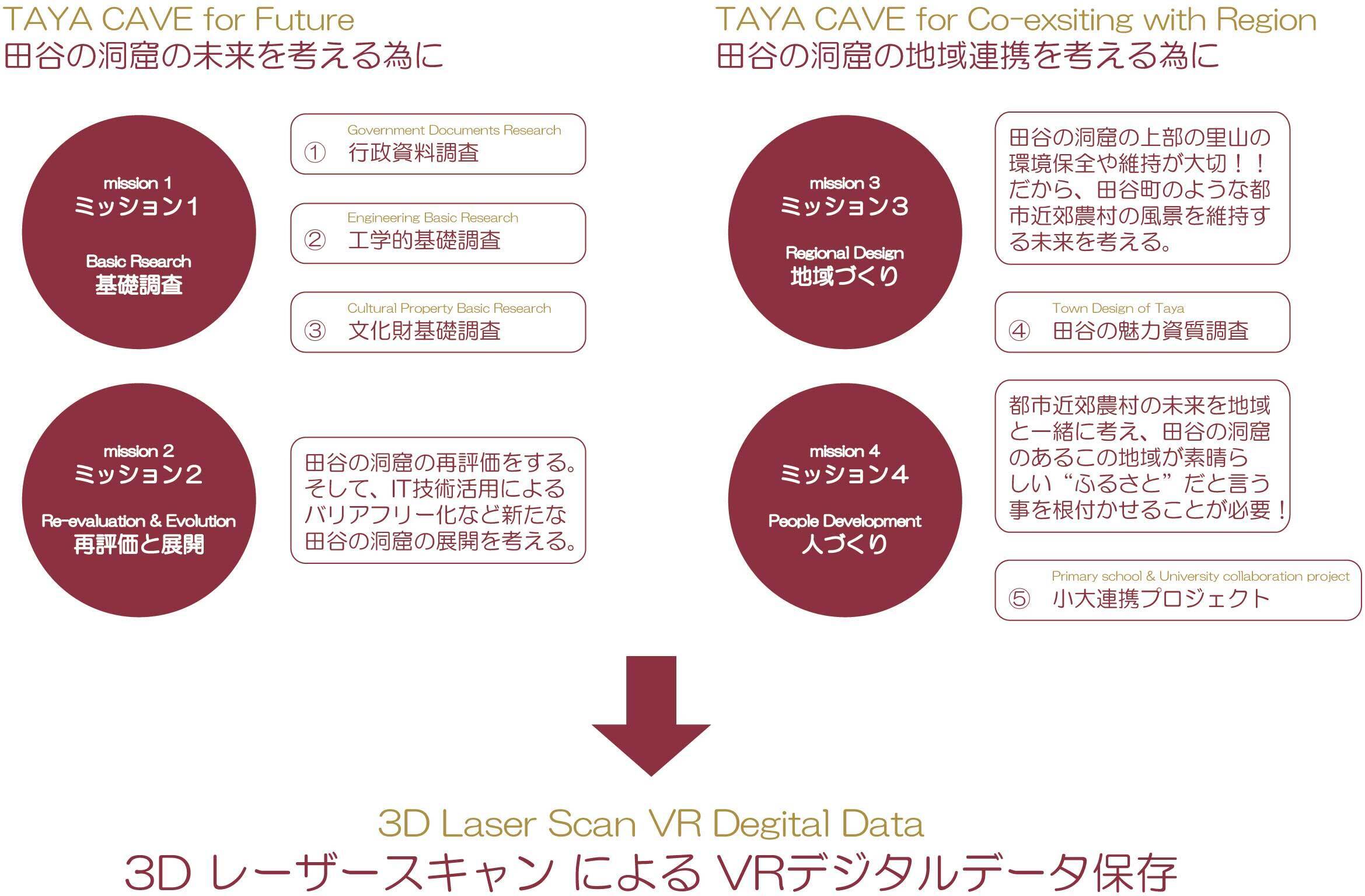田谷の洞窟保存活動は、多岐に渡っています。大きく4つのミッションを掲げています。その為の、数多くのプロジェクトが進行中です。下記図表をクリックするとさらに詳しい内容を確認できます。
