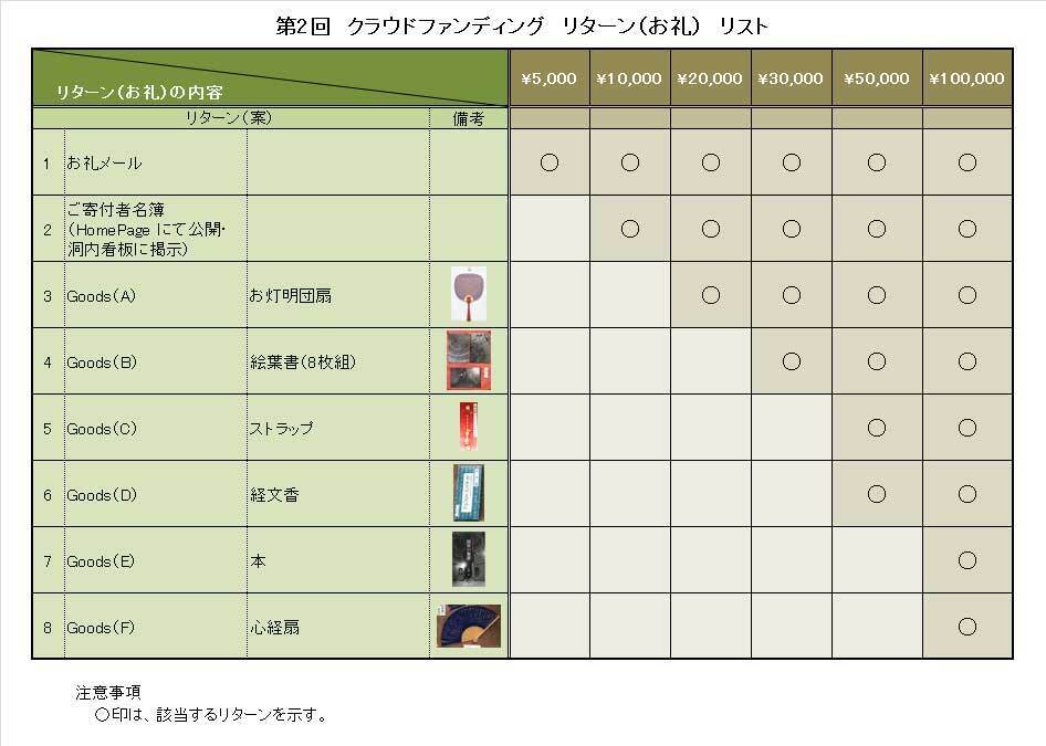 心ばかりではありますが、ご支援頂いた方々には下記表のお礼をさせて頂きます。