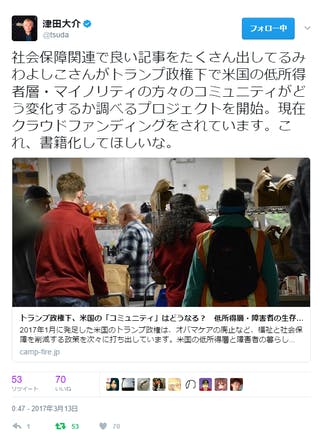 あっという間にリツイート50回以上。津田さん、ありがとうございます。