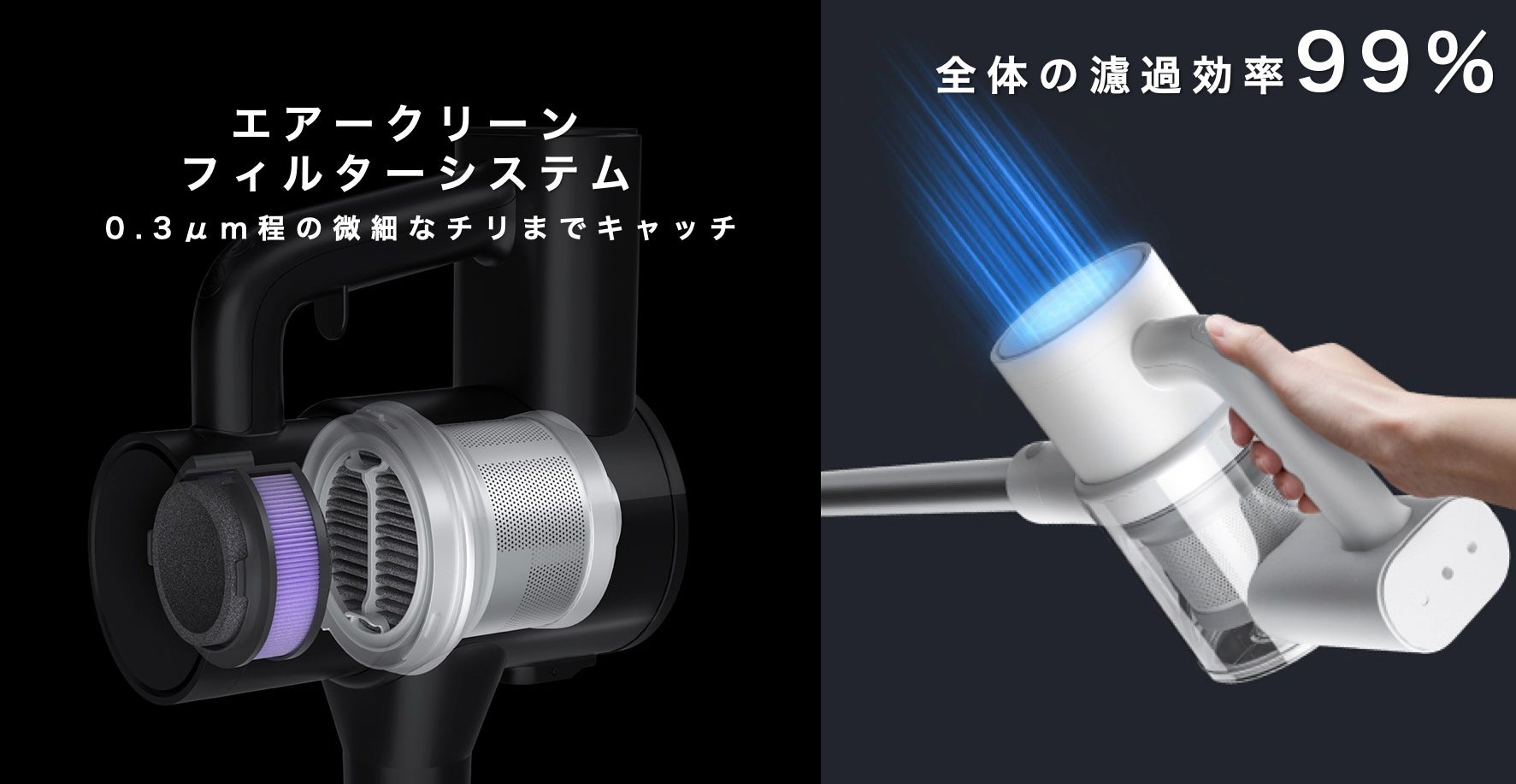 クレアのリアフィルターエレメントは非常に強力で、目に見えない0.3ミクロンの小さなダニやほこりをろ過し、掃除中に発生したほこりやウイルスをしっかりと止めます。3つの抗菌システムは、掃除機全体に組み込まれているので、機械全体の濾過効率は99%、殺菌率は99.99%と、毎日清潔にお掃除をすることができます。