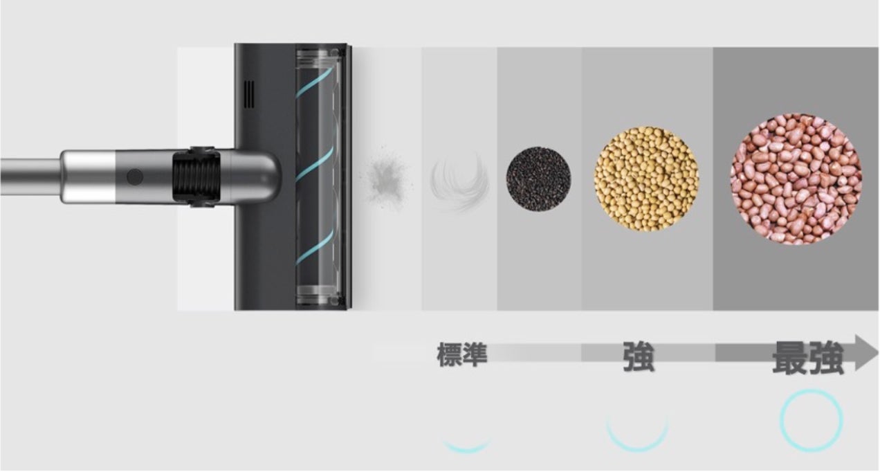 汚れ具合、散らかってしまったゴミの大きさに合わせて強弱を調節可能。微細なゴミから大きなゴミまでぐんぐん吸収します。