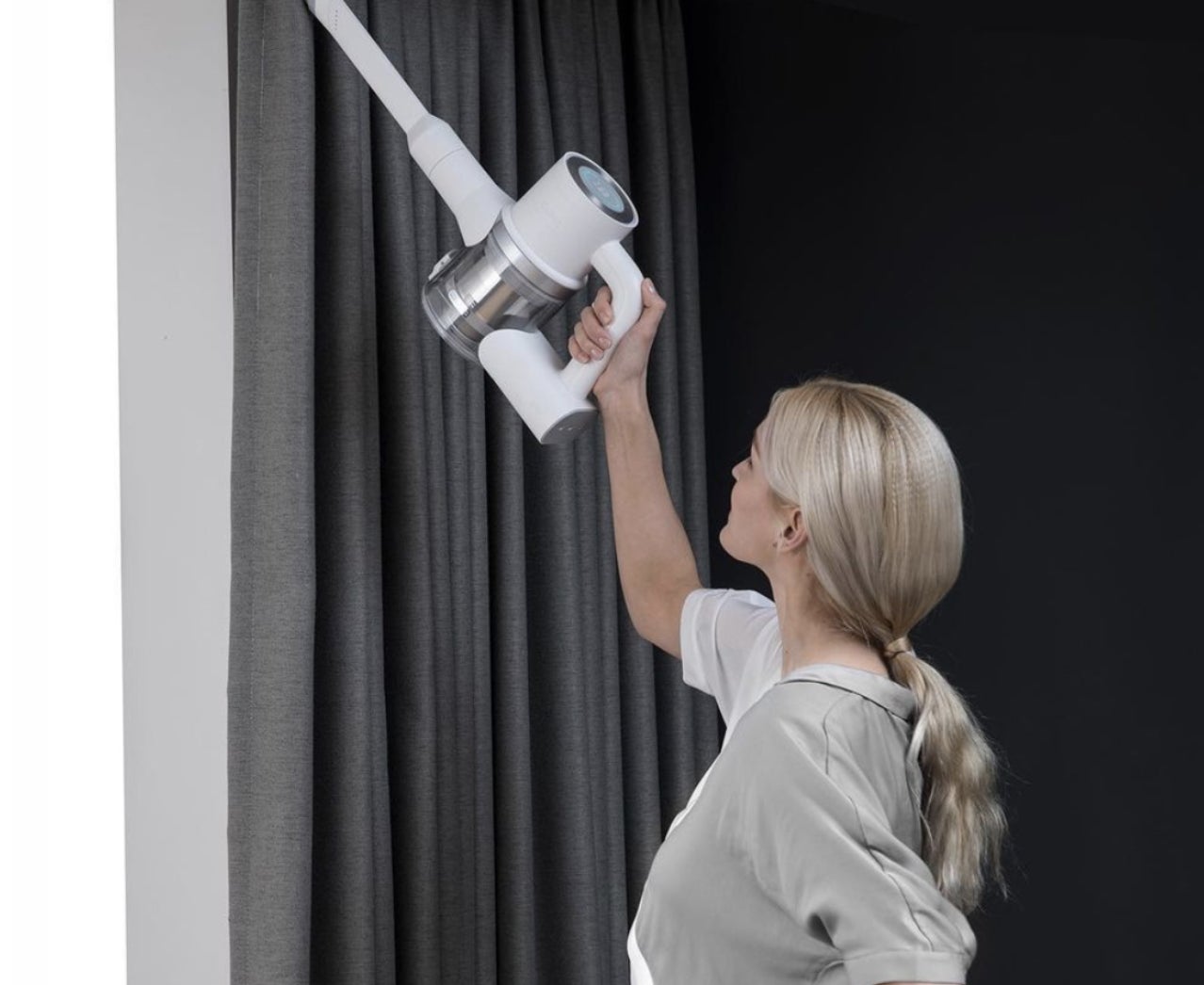 ヘッドは1.65Kgの超軽量設計のため、床だけでなく天井の汚れやカーテンについたホコリまで片手でラクラク吸い取ります。
