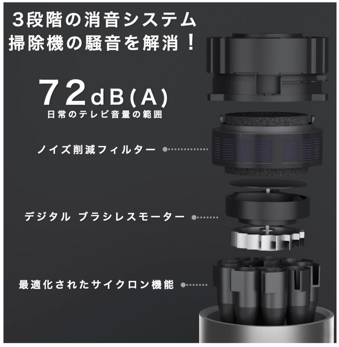 出力が強い掃除機は、騒音が心配ですよね。クレアは3段階の消音システムで騒音を改善。会話が聞こえるほどの、日常のテレビ音量の範囲である70dB前後に音量が設定されています。