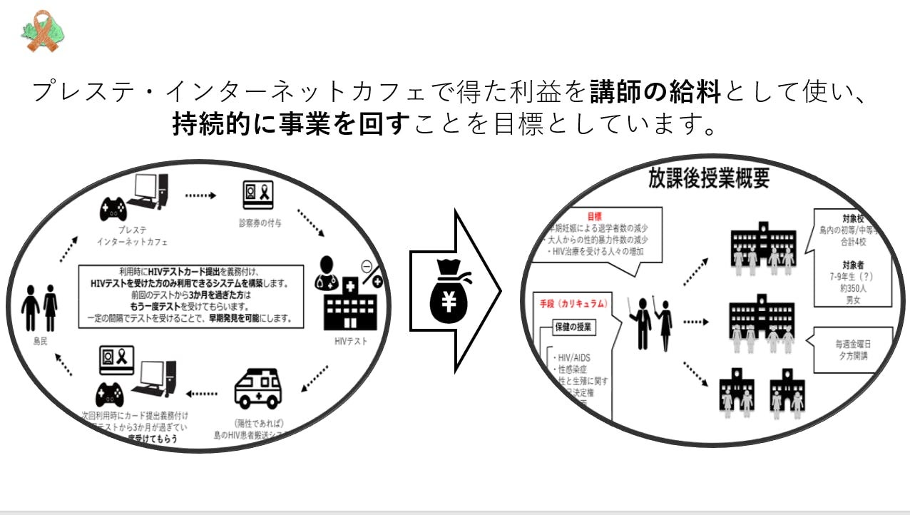 の2つの手段を島民へ届けるためのプロジェクトを、このクラウドファンディングを通じて実行します。そのために、ケニア・ムファンガノ島でHIV/AIDSと戦うため2つの計画を準備しました。一つは、初等・中等学校に対してHIV/AIDS・性教育の授業を行い、HIV感染を予防すること。もう一つは、既存のプレステ・インターネットカフェにHIV定期テストカードシステムを組み込むことで住民のHIV早期発見を促すことです。