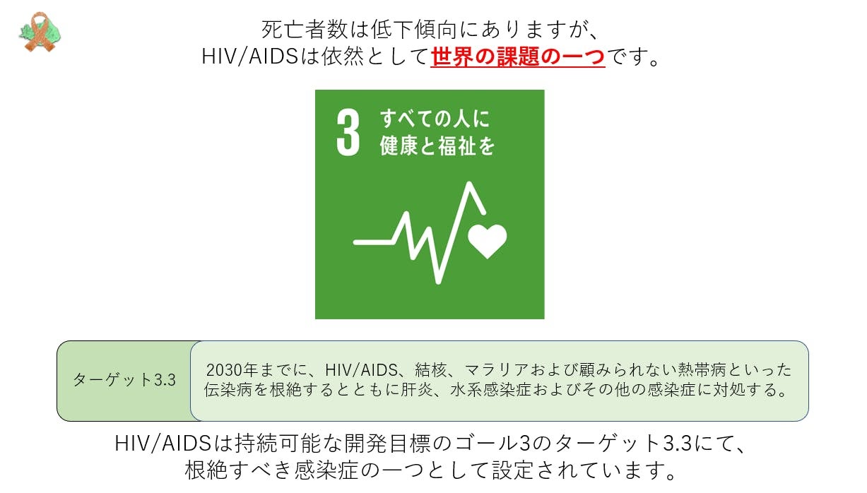 死亡者数こそ減少傾向にあるものの、HIV/AIDSは依然として世界全体で取り組むべき課題の一つです。持続可能な開発目標のゴール3「すべての人に健康と福祉を」では、HIV/AIDSが根絶すべき感染症として指定されています。
