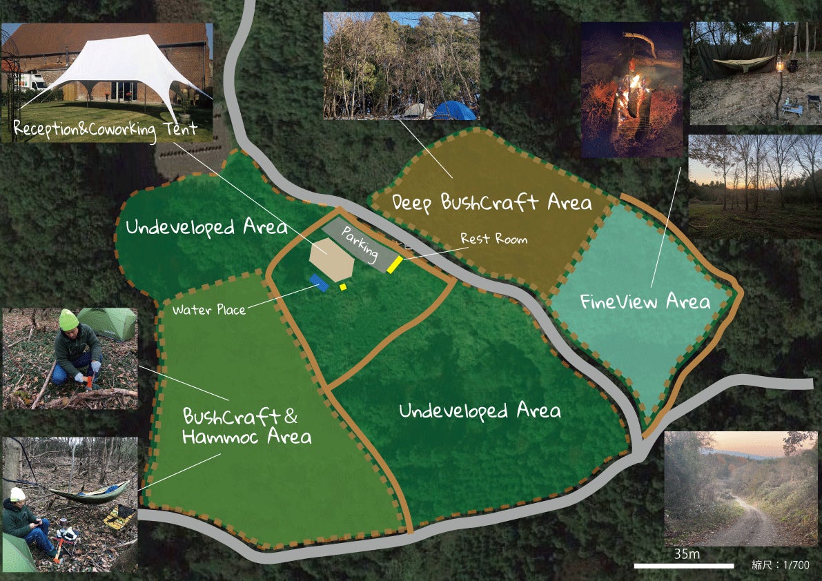 もともと「なるべく手を加えない」がテーマでしたので、サイトに関しては宿泊するだけであれば、現時点でソロテント基準で50〜70張程度の広さを確保しています。フリーサイト方式で受付順に思い思いにご利用いただければと思います。