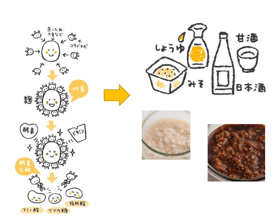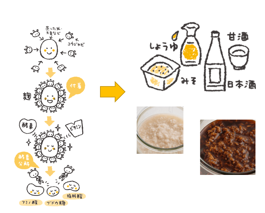 ここで、私が魅せられた「発酵食品」の中でもYajikkoKITCHEの要となる「麹」について少しお伝えします。麹とは蒸した米・大豆などの穀物に麹菌が付着し様々な酵素や栄養素を生成しながら繁殖したものをさします。日本人が昔から食卓で使用していた調味料は麹からできているものがほとんど。