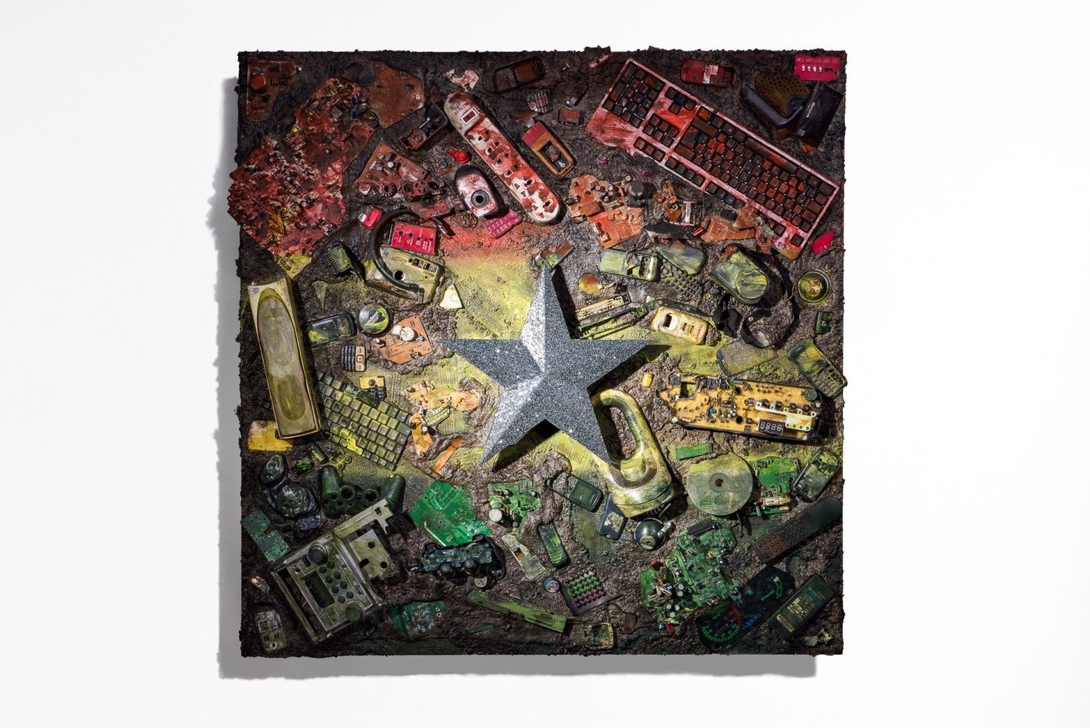 帰国後、スラムでも不必要になった電子機器ゴミを持ち帰り、それでアートを製作。