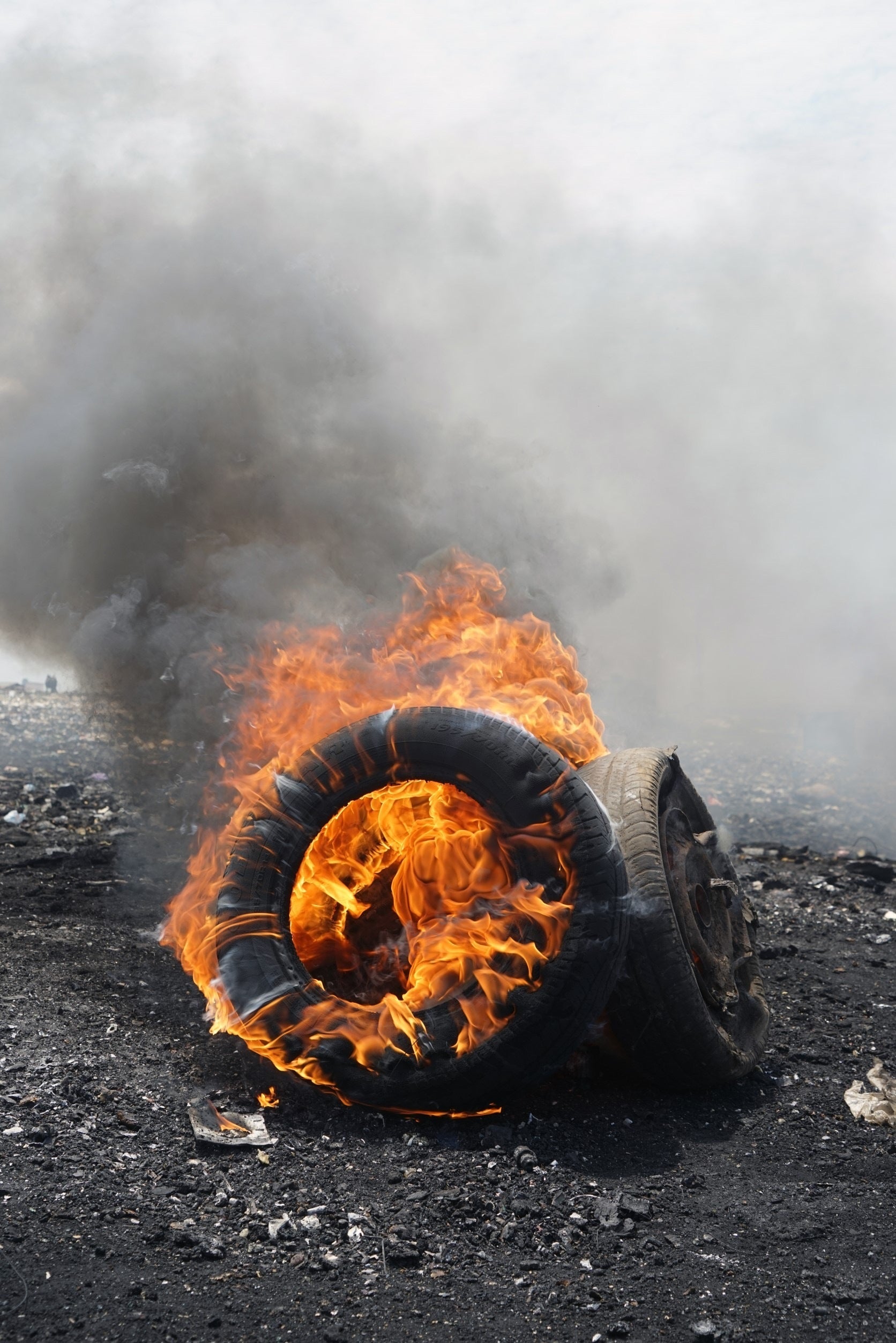 燃え盛る、タイヤ、このタイヤからも中に隠れている金属ワイヤーが取り出せます。