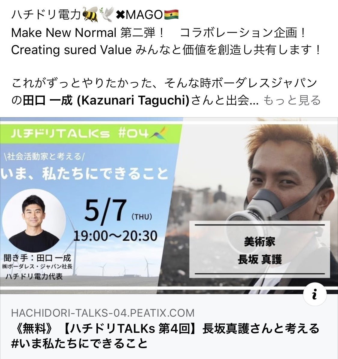 拝啓コロナ様【2通目】ハチドリ電力✖︎MAGOMake New Normal 第二弾! コラボレーション企画!コロナに負けない!Creating Shared Value みんなと価値を創造し共有します!これがずっとやりたかった、そんな時ボーダレスジャパンの田口 一成 (Kazunari Taguchi)さんと出会えた、各家庭では、必ず電力会社と契約しています、今まではただの契約、値段が安いかどうかだけ、それしか価値がなかった。しかしハチドリ電力は、100%太陽光などの自然電力が選択できかつ、支援メンバーを選び、電気代の1%がガーナプロジェクトの支援に直結します、さらに電力契約者と支持されたメンバーはクラブ会員になりコミュニティーを形成していく、僕の活動や考えを共有しながら新しいこれからの新常識へ向かって突き進んでいく、これは国境なき村づくりみたいなもの、ボーダレスソサエティーです。これを昔からやりたかった、うちのおじいさんは石川県の長坂という土地で村をつくりそこの区長として沢山のメンバーと苦楽を共にしていた、今の先祖の家が石川県の山ろく民族資料館に有形文化財として保存されています。 今回は自然電力で作られた、同じ電力を使う志のメンバーとこれからの美しい未来へ向かって同じ船に乗り、新しい国境なき世界へ向かう、皆さんが僕を支援していただけるなら、僕はその支援以上の金銭では返せない対価を皆様にアートを通じて提供していきます、コロナなんかに絶対負けない!感染リスクゼロのこのコミュニティに参加して、ガーナのスラムが美しい街に変わるまで、電力をハチドリ電力に切り替え是非僕とお付き合い下さい!僕の支援ページ⬇︎https://hachidori-denryoku.jp/list/category2/1009/そして、ボーダレスジャパンの田口さんとズーム対談が実現! 参加無料ですが、人数が1000名に限られていますのでぜひお申し込みをよろしくお願いいたします! GWおうち時間一緒に過ごしましょう!熱い90分間違いないです!【ハチドリTALKs vol.4】社会活動家と考える #いま、私たちにできること 日時 : 5/7(木) 19:00〜20:30料金 : 無料方法 : オンライン(Zoomアプリ使用)登壇者 : 長坂真護申込:https://hachidori-talks-04.peatix.com/ 長坂真護とハチドリ電力のコラボイベントを5/7(木)19:00〜20:30に開催します。 ハチドリ電力はCO2ゼロの自然由来100%の電気を届け、月々の電気代の1%が社会を良くするために活動する人や団体の支援に、もう1%が再生可能エネルギー発電所の増設につながるという新しい仕組みを展開するエネルギー事業です。 『ハチドリTALKs』は、ハチドリ電力と提携する社会活動家が登壇し、ハチドリ電力代表 / 株式会社ボーダレス・ジャパン代表取締役社長の田口一成が司会進行するトークセッションを通して、各団体の活動内容や設立のきっかけなどを人生談とともに紹介していくトークイベントです。 このイベントの第4回目のゲストとして、長坂が登壇します。 当日は活動を始めたきっかけやこれまでの歩み、これからの展開などを、第一線で活動しているからこそ分かる現場のリアルと合わせてお話しします。ぜひご参加ください! 【お申し込みはこちら↓】https://hachidori-talks-04.peatix.com/