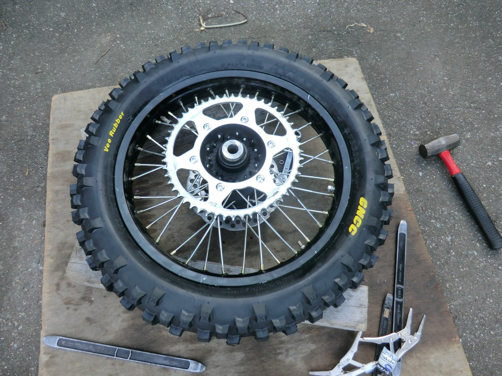 オフロードバイクの場合、重量が100キロくらいしかないので、整備スタンドと工具があれば、ほとんどの整備が自分でできます。日常的に行う点検、チェーンへの給油、タイヤ交換も割と簡単です。大きなプラモデルと考えればいいです。整備のやり方は、バイク屋さんで見せてもらうのが一番手っ取り早いです。最初のころ、私も暇なときにバイク屋さんに入り浸って、整備を見せてもらいました。腕のいい整備士さんの作業は見ていて気持ちいいくらいです。オフロードバイクで一番多いのは、タイヤ交換です。パンクした時だけでなく、雨が降ったり、走る場所でタイヤを交換することが多いのです。タイヤ交換はバイクを整備スタンドで持ち上げてやります。リアタイヤなら、アクスルナットを外して、チェーンをはずし、タイヤを取り外します。チューブから虫を外して空気を抜きます。このとき、木の枠で作った台があると便利です。ホームセンターで木の切れ端を買ってくると1000円もあれば作れます。台の上に乗せたタイヤを足で踏んづけて、ビードをタイヤのリムから外します。タイヤレバーを差し入れて、ビードをめくっていきます。片方のビードが外れたら、中のチューブを取り出します。もう片方のビードを外すときは、レバーを入れてハンマーでたたくと簡単に外れます。タイヤを入れるときはこの逆をやればいいです。チューブをレバーで引っ掛けないようにします。チューブを入れてすぐに空気を入れてタイヤになじませるといいです。タイヤ交換だけでなく、クラッチ交換、ブレーキパッド交換、ピストン交換などは思っているより簡単です。さすがにクランクやギアになると特殊工具が必要になってくるのでむずかしいのですが、それほど頻繁にすることはないので、バイク屋さんに頼んだほうがいいでしょう。言い忘れましたが、整備の前には洗車するのがお約束です。必ず、きれいな状態で整備しましょう。泥があると壊れている個所を見逃すこともあります。