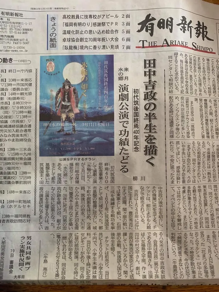 最初にこの演劇を通して、田中氏の時代の真実を伝えることを始めたのは、2015年2月22日に柳川市の料亭で、2月18日の田中吉政ご命日法要後の公演でした。