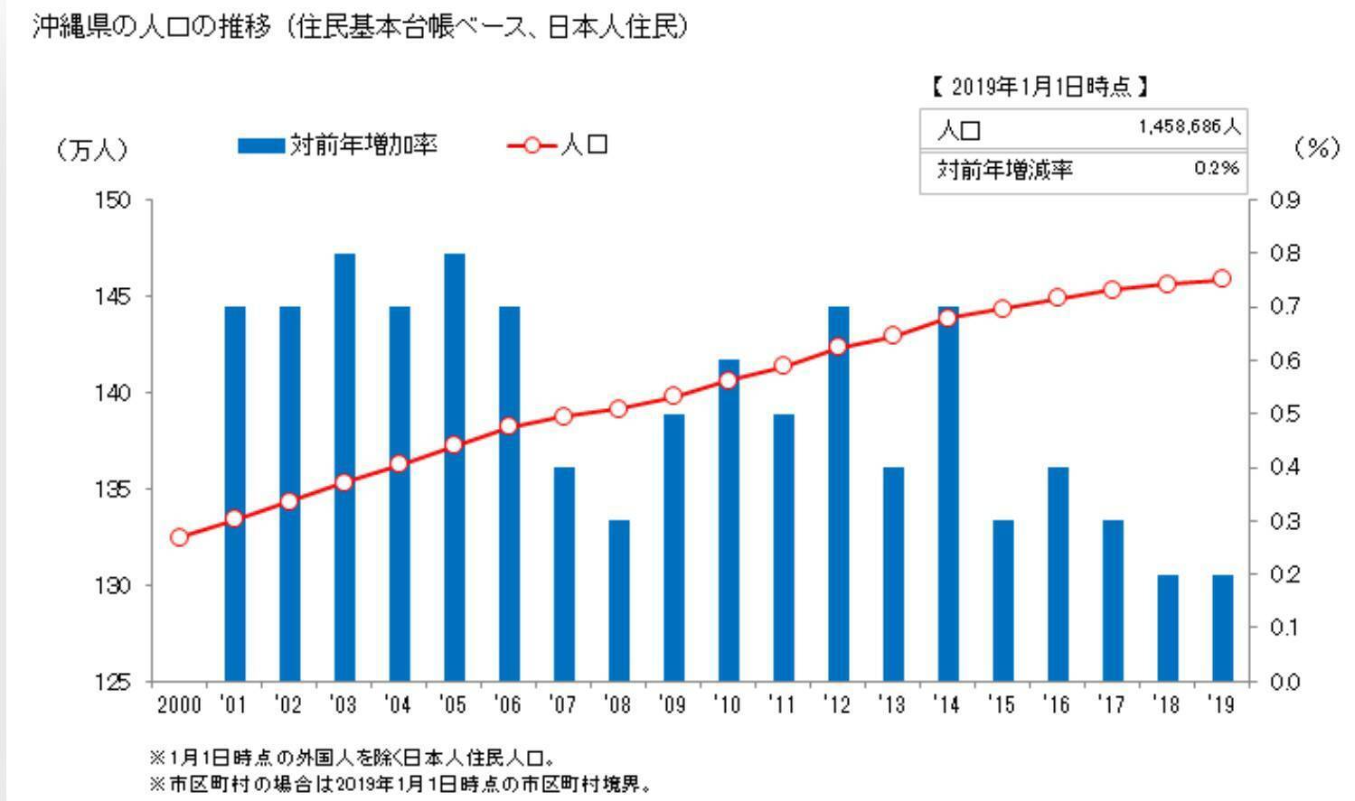 日本の人口は年々減少し、2019年12月1日時点で約1億2626万5千人となっています(総務省人口推計)前年に比べて-26万4千人と年々人口は減り続けていますが、ここ沖縄では年々増加していて145万人