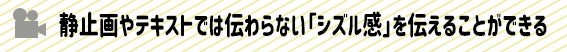 画像やテキストよりも音や動きがある動画の方が、圧倒的に「シズル感」を出しやすい、つまり見る方の涎を引き出しやすいのです。