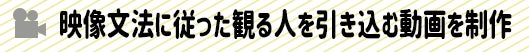 まさに映像における文法で、英文法とよく似ています。英語が分からない人に英文法がめちゃくちゃな英語を話すと、『何となく違和感を感じるけれど、何がおかしいのかは分からない』そんな状態になります。映像文法がしっかりと考えられた映像はスッと頭の中に情報が入りやすいようにできています。つまり観た人に行動を起こしてもらいやすくなるのです。