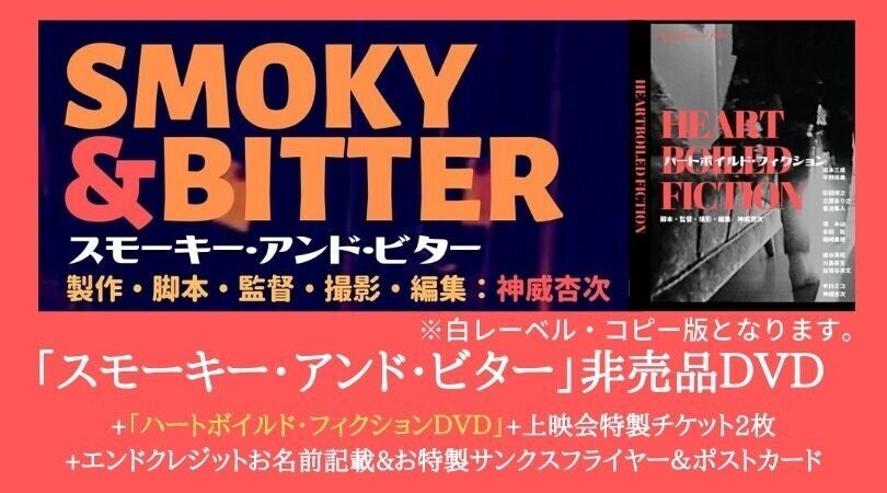 『スモーキー・アンド・ビター』本編完全収録DVD+特製チケット5枚+エンドロールに「協賛」でお名前・会社名・屋号等を記載+ご支援者お名前入りサンクスフライヤー+映画のポストカード+「ハートボイルド・フィクション」DVD+ご希望キャストの記念ポストカード5名分+特製DVD+映画パンフレット