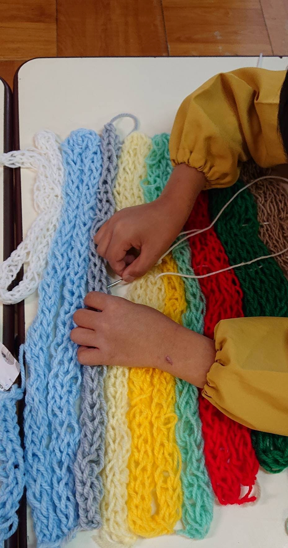 多くはありませんが、染色加工工程で捨てられるような糸や見本の残りを集め、いくつかの保育園お渡ししています。先生方が巻いてくれた毛糸玉から、園児たちは指編みを作ってくれます。特に夕方、家族のお迎えを待つ間、真剣な眼差しで作り続けます。女の子はもちろんですが、男の子の一生懸命な様子がとてもかわいいと評判です。いつもはやんちゃな子も一生懸命作ってくれているようです。糸の力が、糸の魅力が上手に伝わっていると嬉しく思います。