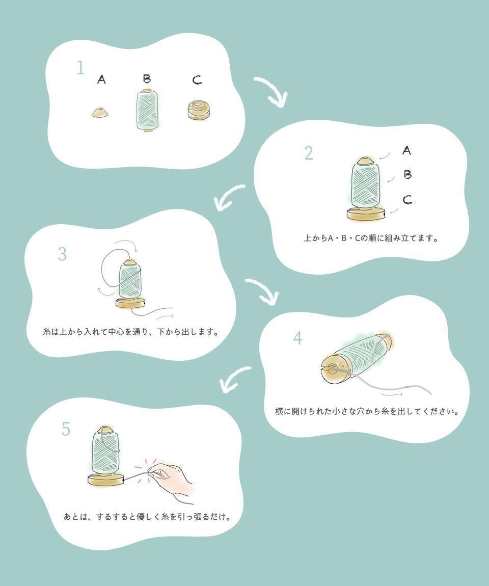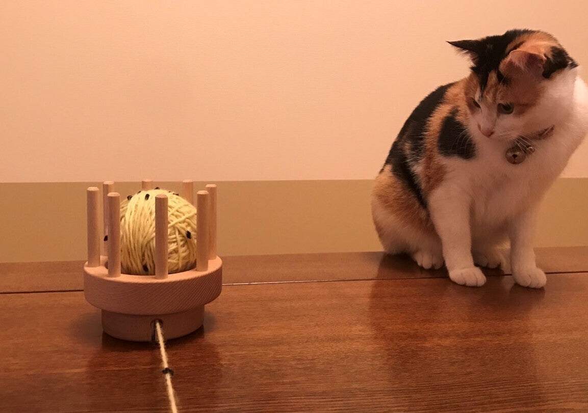 手のひらで受けるように糸を優しく包み込み取り出す「マル型するりぃと」。暴れん坊の「毛糸玉」が、おとなしくなります。「毛糸玉」を取り出すときの糸の動きは、思わず心がほっこりします。