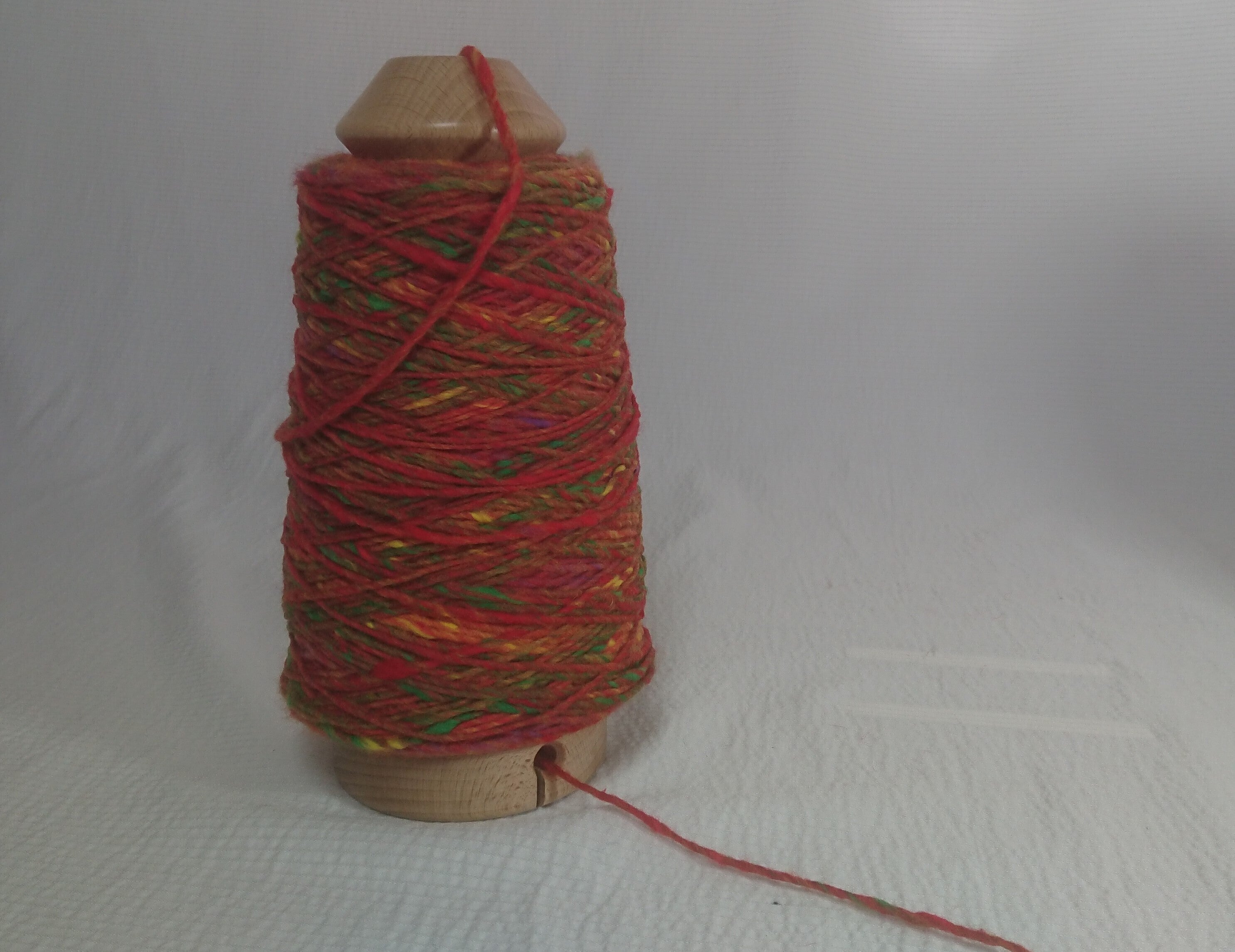 もともとコーン(紙管)に巻いた糸は、繊維工場で使用されていました。専用の台に乗せ上方向に引っ張り出し、ガイドを通して機械に供給されます。大掛かりな装置を、手のひらに乗せられるような大きさに集約したのが「タテ型するりぃと」です。