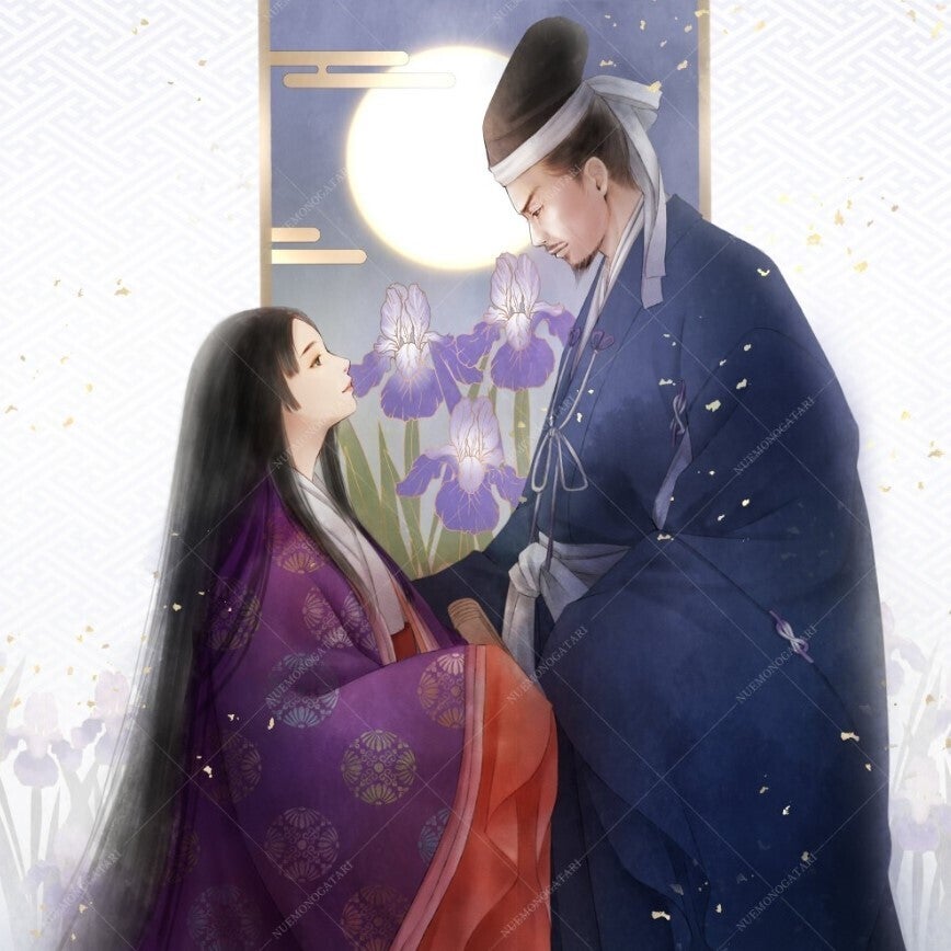 本日は梅雨に向かう季節に先立ち、絵師 甲斐千鶴様より武将 源頼政様と菖蒲御前が見つめ合う一幕の仕上げをお届けいただきましたので、先んじて皆様にお披露目させていただきたく存じます。菖蒲御前のお名前にちなみ菖蒲の花をあしらっていただいた涼しげな本作を、夏に向かう季節の一服の涼としていただければ幸いに存じております。