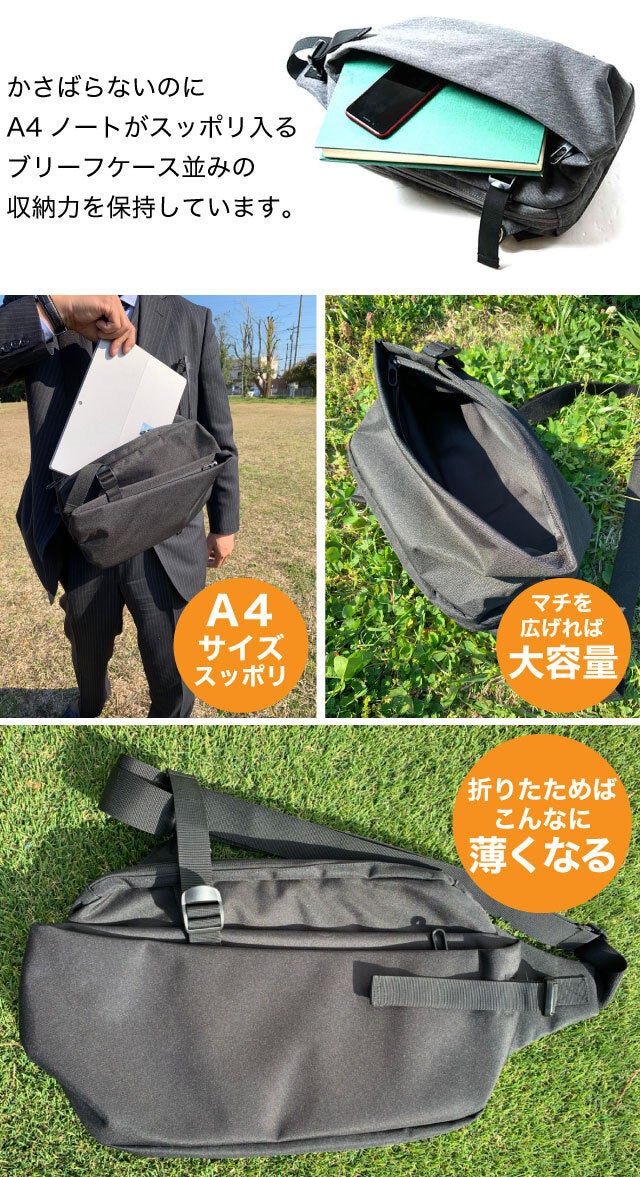 大容量の収納スペースはこのバッグの特徴です。 旅行先での手土産や出張先での配布資料など、急な荷物の増量にも対応が可能。しかし荷物が少ない時も大きなバッグを持ち歩くことになってしまっては、ボディバッグの意味がない・・。でもこのボディバッグは 普段、荷物が少ないときはぺったんこにできます!