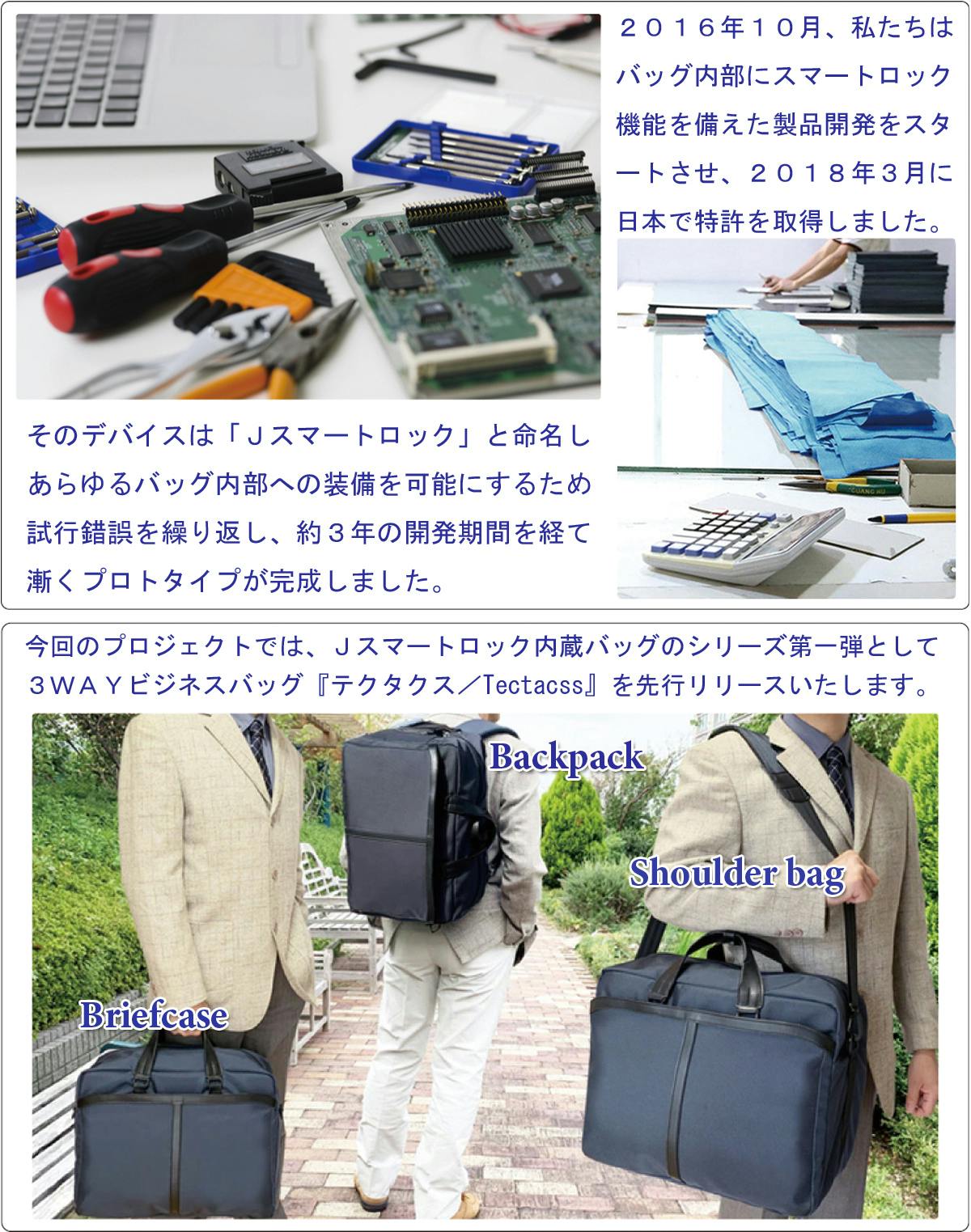 今後は、今回のプロジェクト製品である『テクタクス』に内蔵の『Jスマートロック』を、様々なスタイルのバッグに採用し世界の方々にご提供させていただくことと、これ以外にも夢・アイデア・優しさが溢れるモノ創りへの挑戦をしつづけたいと考えております。