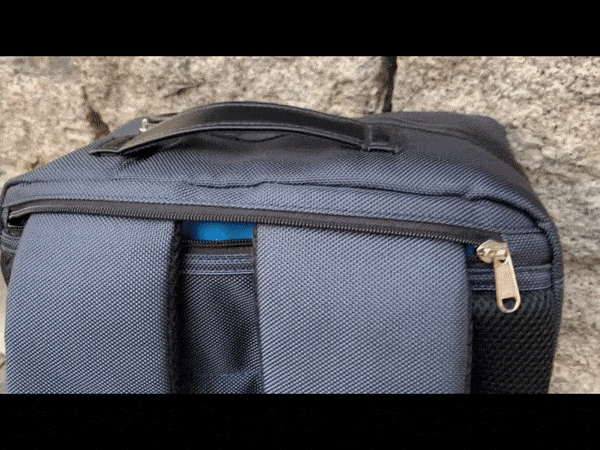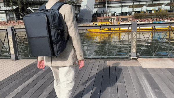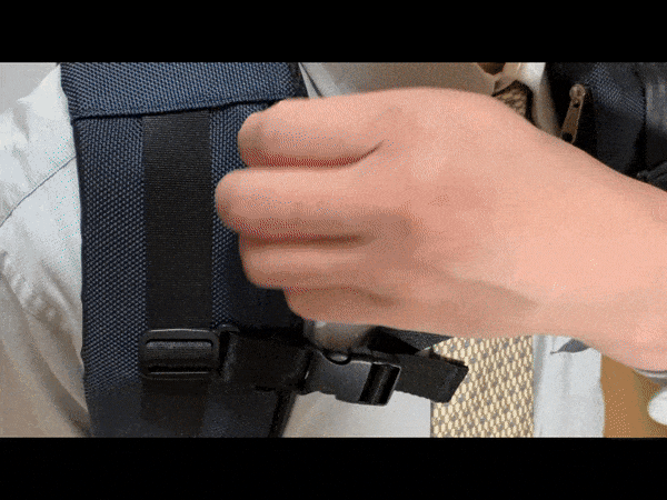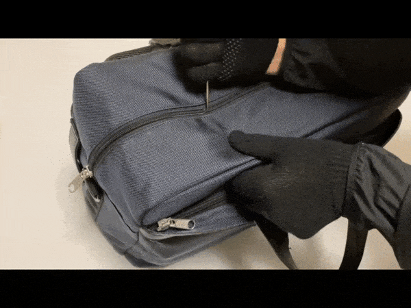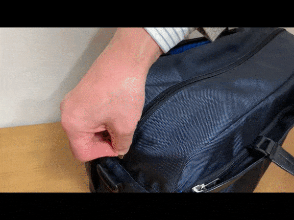 バッグを施錠中に、付属のRFIDカードキーを内蔵のJスマートロック付近にかざすとリモコンやスマホがなくても解錠することができます。RFIDカードキーで解錠しファスナーを開け、次にファスナーを閉じた時は毎回5秒後に自動施錠するようプログラムしています。